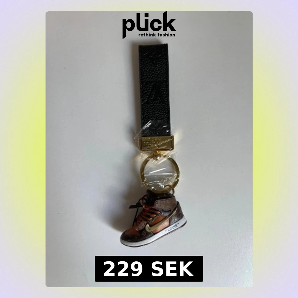 Snygg nyckelring med svart läderrem och guldfärgad metallring. Hängande detalj i form av en miniatyrsneaker i brunt med klassiskt Vuitton-mönster och orange snörning. Perfekt accessoar för dig som gillar streetstyle och lyxiga detaljer.