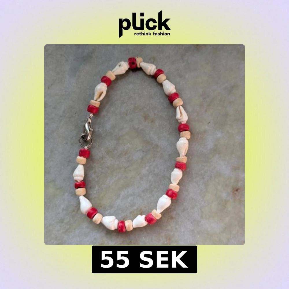 Unikt armband med vita snäckor och färgglada pärlor i rött och beige. Armbandet har en praktisk metallhake för enkel på- och avtagning. Perfekt för att ge en bohemisk touch till din stil.
