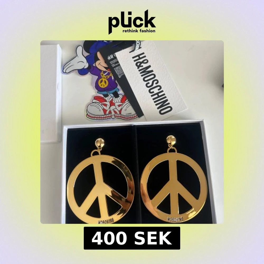 Statement-örhängen i blank guldton från H&M x Moschino. Designen är rund med ett utstansat peace-märke och Moschino-logga längst ner. Aldrig använda.