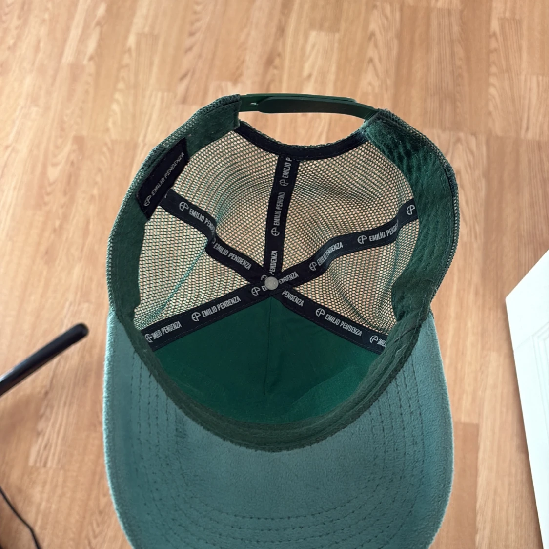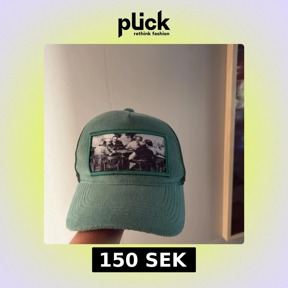 Snygg grön keps från Emilio Pendenza med mesh på sidorna och baksidan för extra ventilation. Framtill finns en svartvit patch med motiv av personer som sitter vid ett bord. Justerbar baktill och cool streetstil.