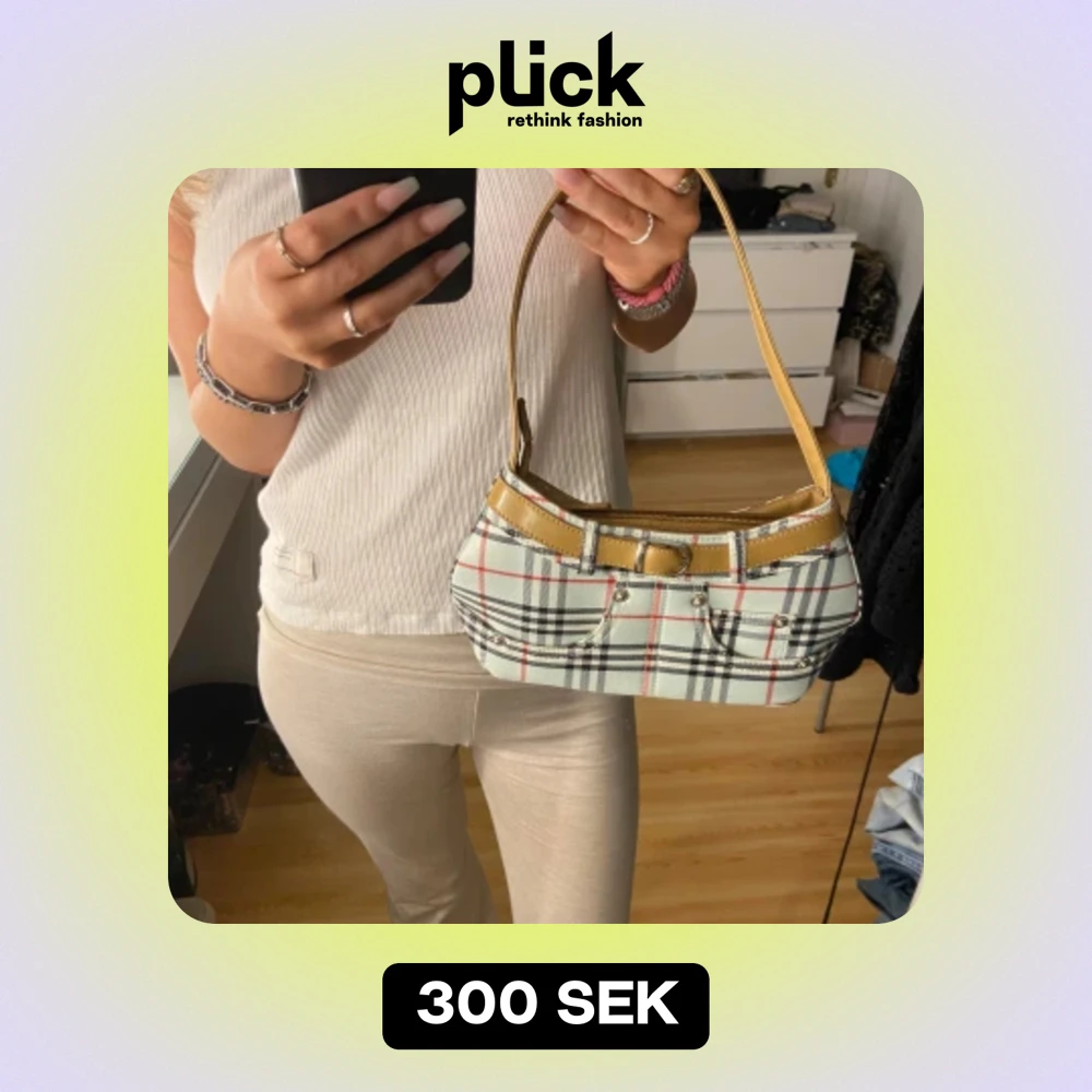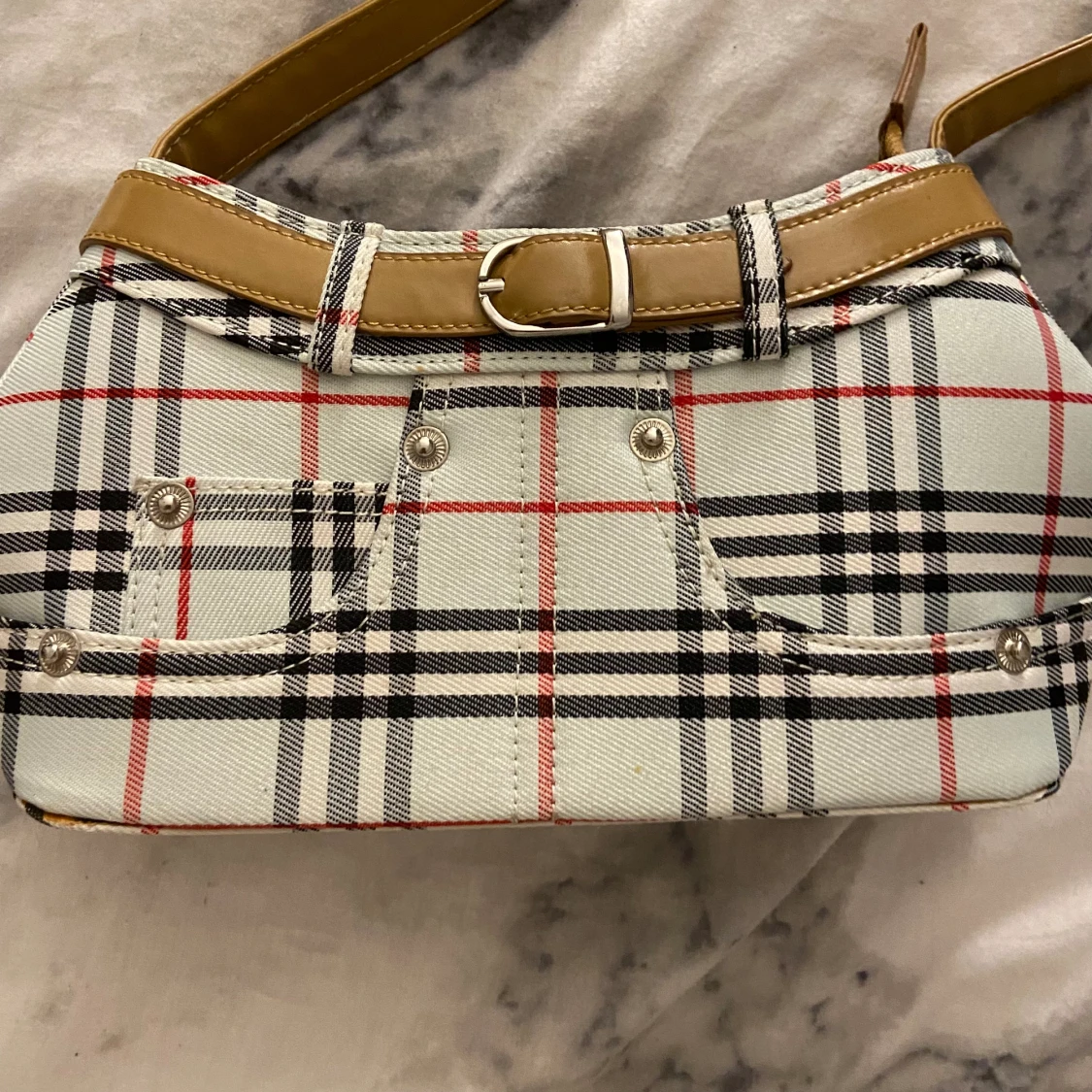 Söt väska som ger lite burberry vibes på mönstret, den är gjord så att det ser ut som ett par jeans med bälte, fint skick! ❣️ Skriv vid frågor osv!