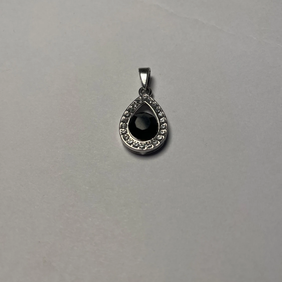 Elegant silverhalsband med ett droppformat hänge. Hänget har en svart sten i mitten omgiven av glittrande stenar. Kedjan är fin och kulformad, vilket ger en stilren look. Perfekt för att ge en touch av elegans till din outfit. Kedja: ca 40 cm. Berlock: ca 1,5 cm x 2 cm. Säljer då det inte kommer till användning.