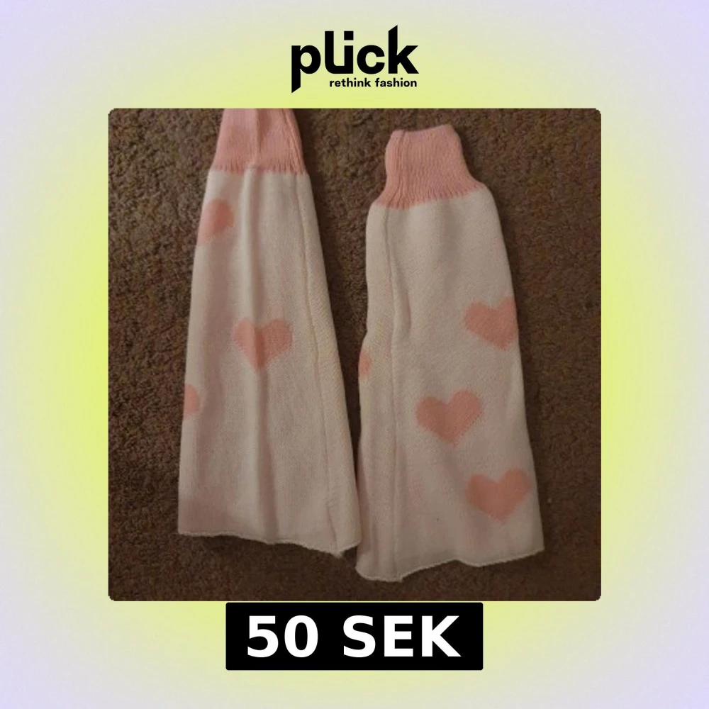 Säljer ett par mysiga vita benvärmare med söta rosa hjärtan. De har en bred ribbad kant upptill i rosa som håller dem på plats.