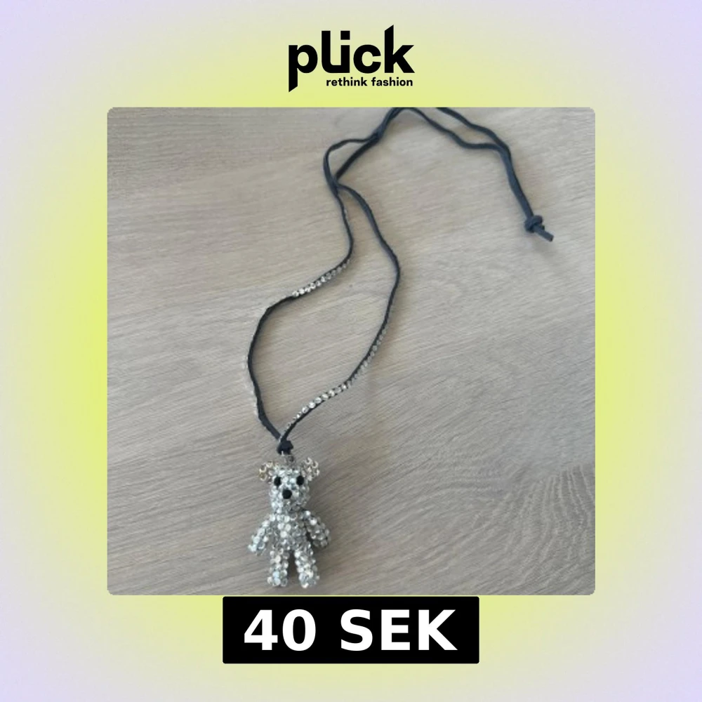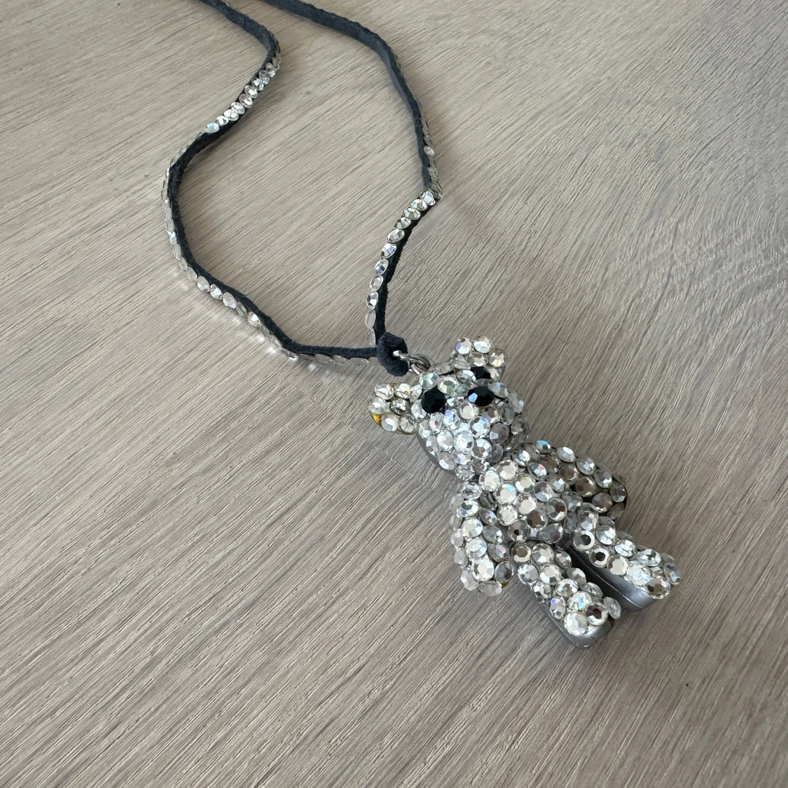 Säljer ett halsband med svart band och en stor glittrig björnberlock täckt av silvriga stenar. Bandet har även silvriga detaljer längs ena sidan. Perfekt för dig som gillar unika accessoarer med lite extra bling.