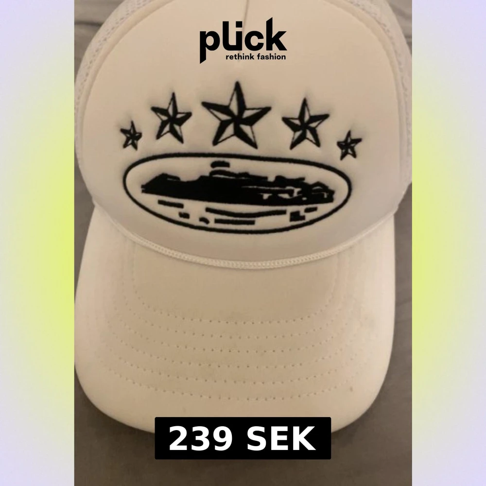 Säljer en vit truckerkeps från Corteiz med svart broderad logga och stjärnor framtill. Kepsen har mesh-paneler på sidorna och bak, samt broderad Corteiz-text baktill. Märkesband på insidan och gul etikett. Perfekt för dig som vill sticka ut.