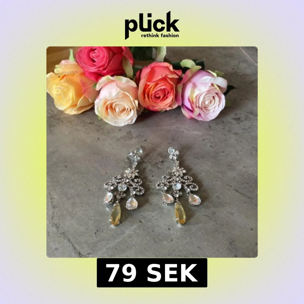 Snygga statementörhängen i silverfärg med gnistrande stenar och kristaller. De har en elegant, svängd form med blommiga detaljer och droppformade hängen i gult och transparent. Perfekta för att sticka ut och ge en lyxig känsla till din look.