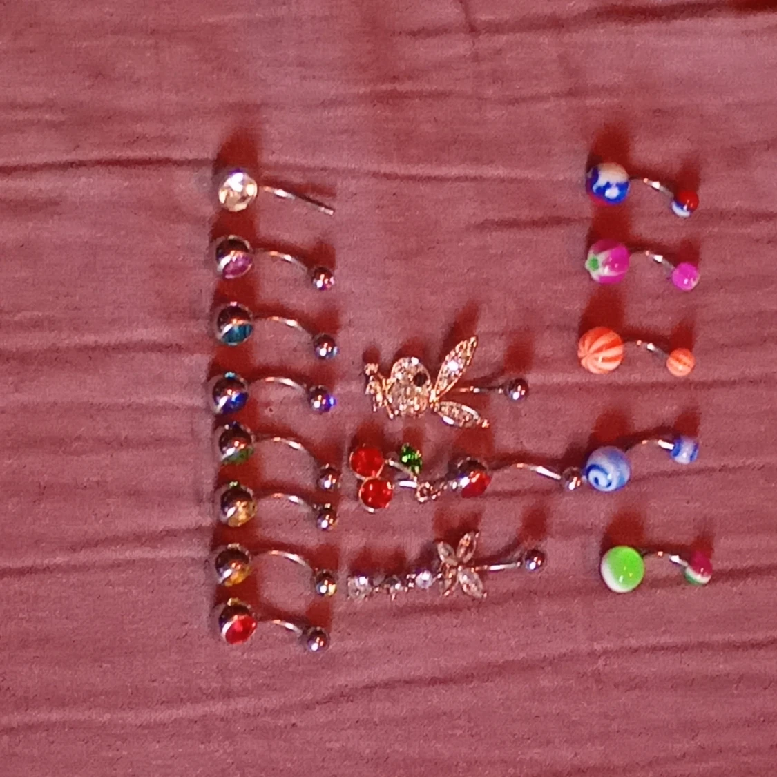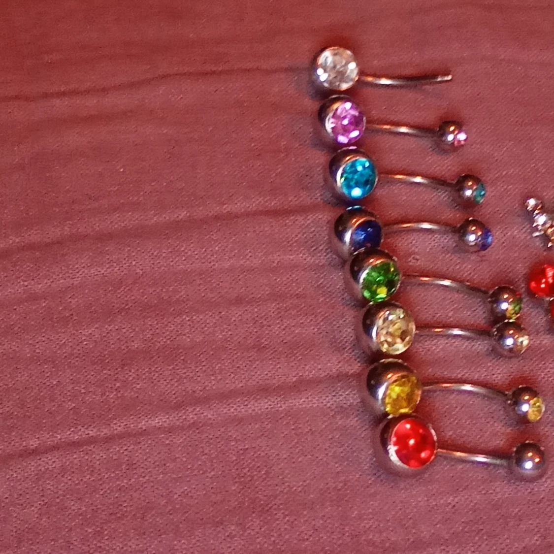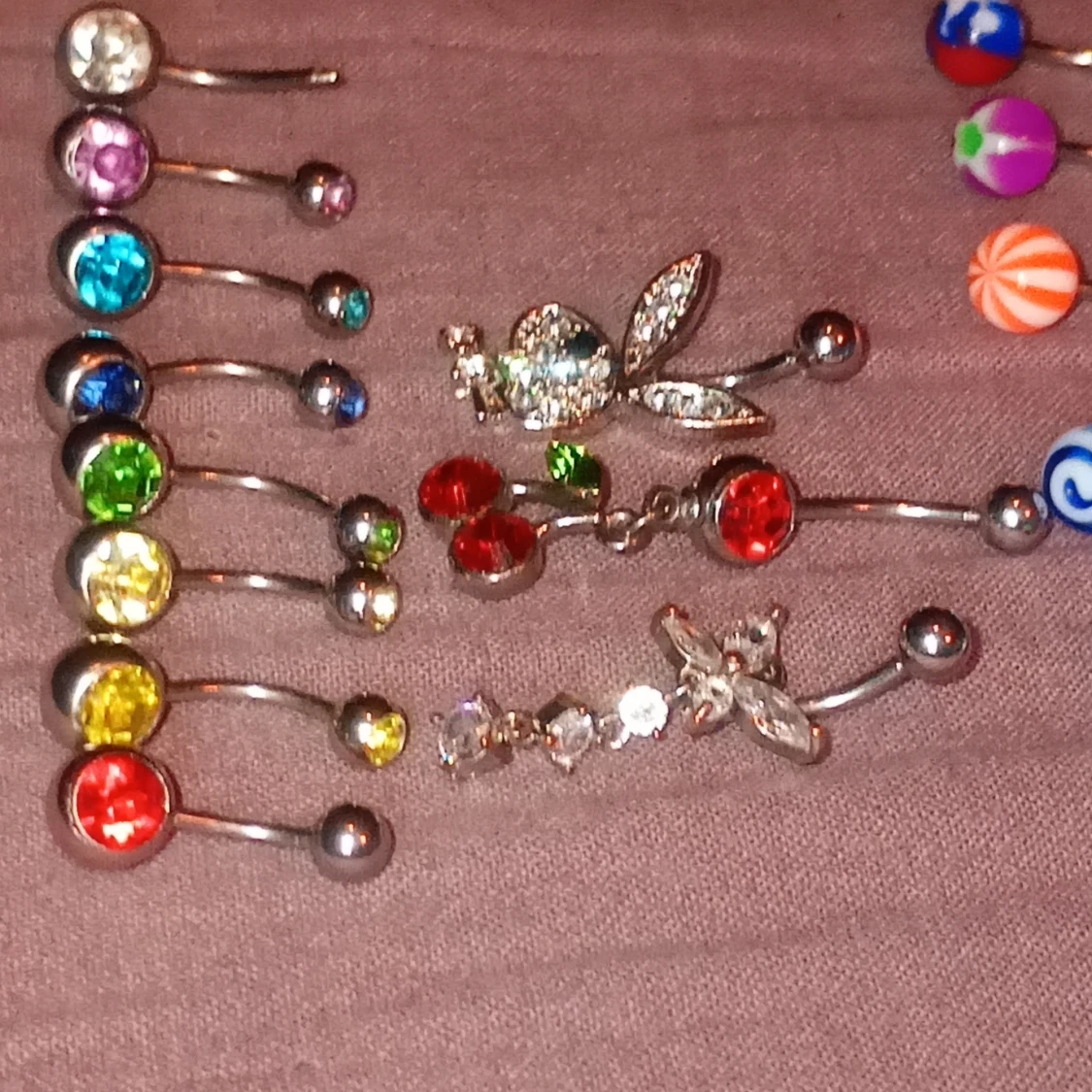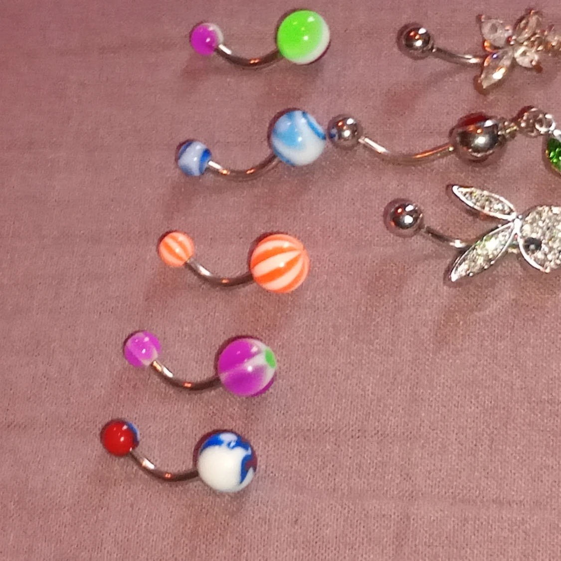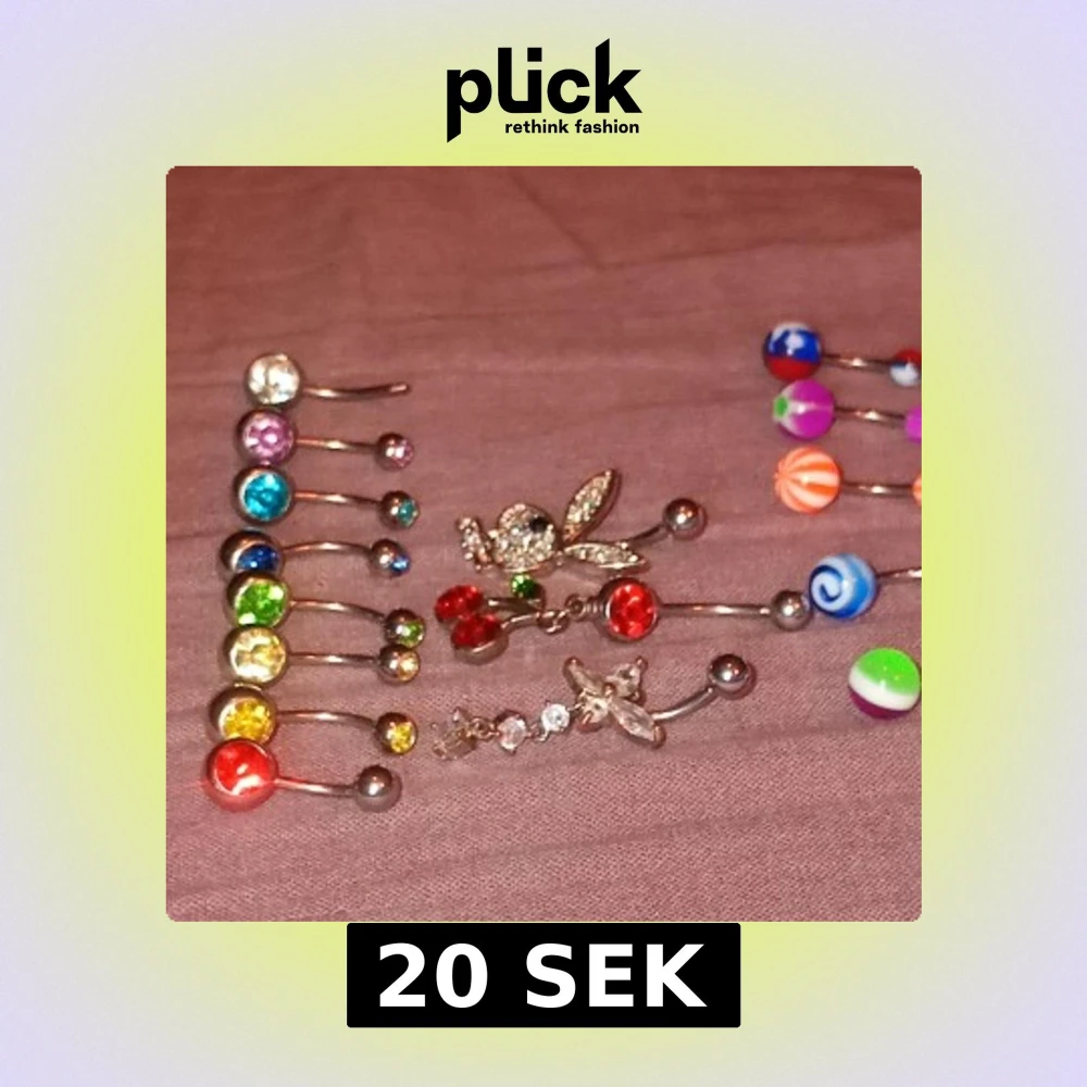 Navelsmycken i olika modeller och färger. 20 kr styck för de längst uppe eller 2 för 35. De färglada längst nere 25 kr styck eller 2 för 50. Hängsmycken 50 kr styck och playboy går inte att skruva av eller jag har åtminstone inte lyckas få av den så 40 kr för den också. Skriv om du är intresserad av någon av dem💗