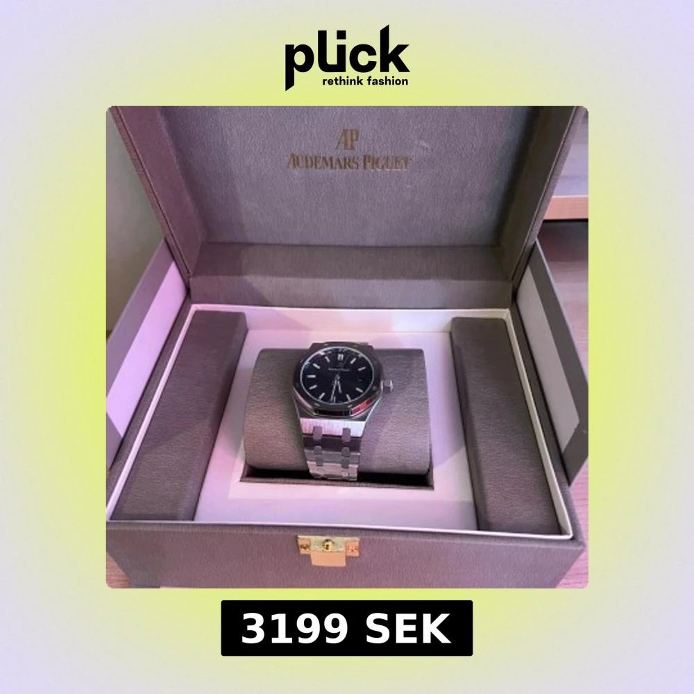Exklusiv Audemars Piguet Royal Oak med ikonisk åttakantig boett i silverfärgat stål och svart urtavla. Klockan har ett stilrent armband i borstat stål och tydliga indexmarkeringar. Levereras i originalbox med extra länkar.