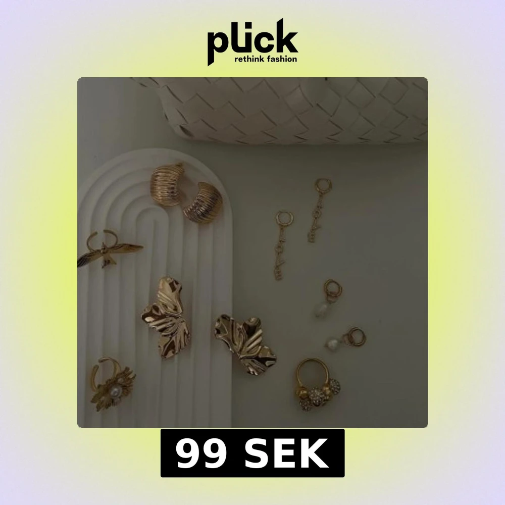 Säljer flera olika guldiga örhängen, bland annat stora blommiga och fjärilsformade modeller, hoops, samt örhängen med pärlor och gnistrande detaljer. Perfekt för dig som vill variera din stil med unika accessoarer.