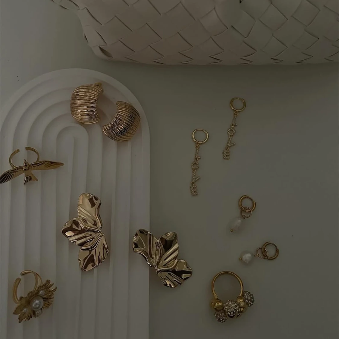 Mix av guldiga örhängen med pärldetaljer