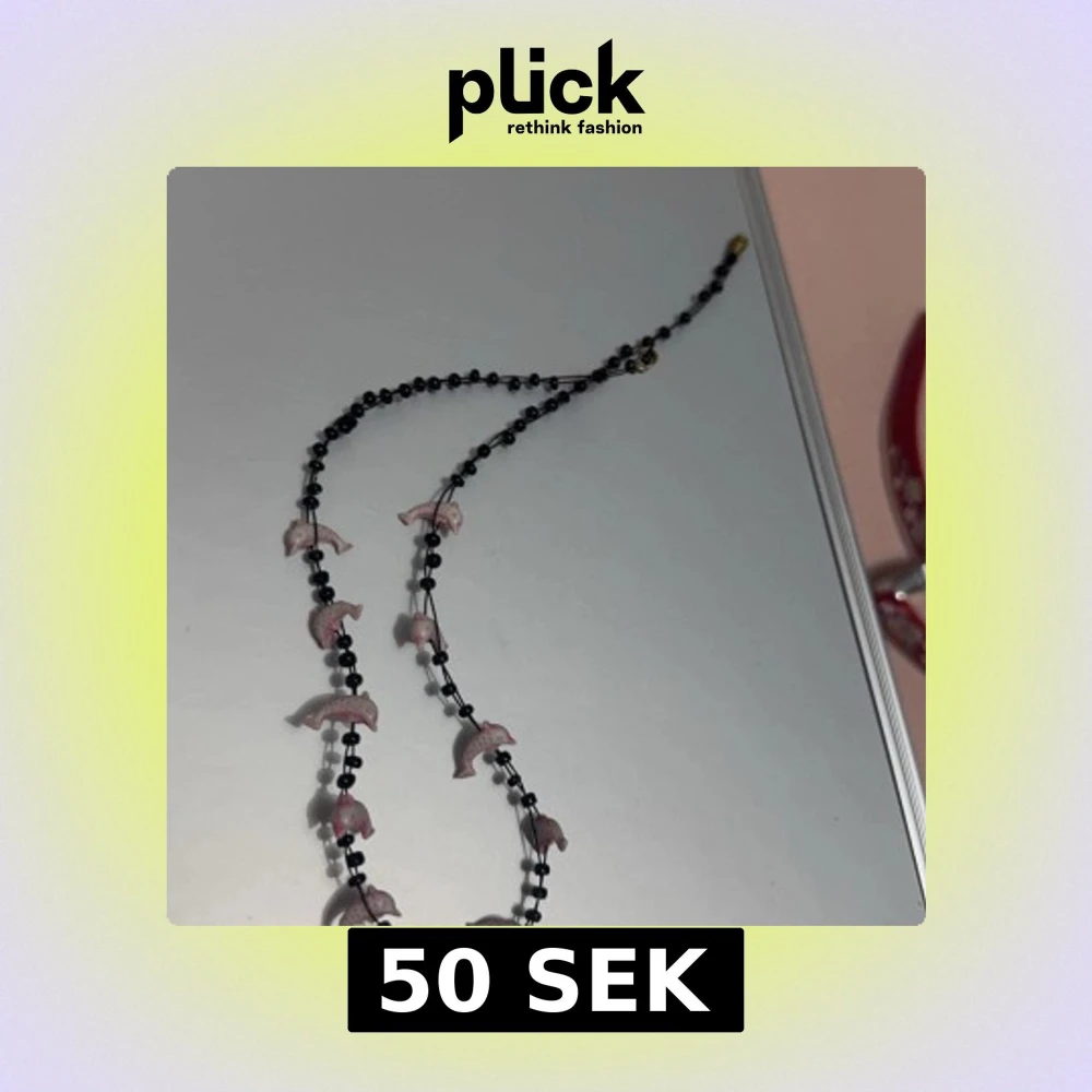 Unikt svart halsband med små rosa delfiner som hänger längs kedjan. Perfekt för att ge en subtil färgklick till din outfit. Passar både till vardag och speciella tillfällen.