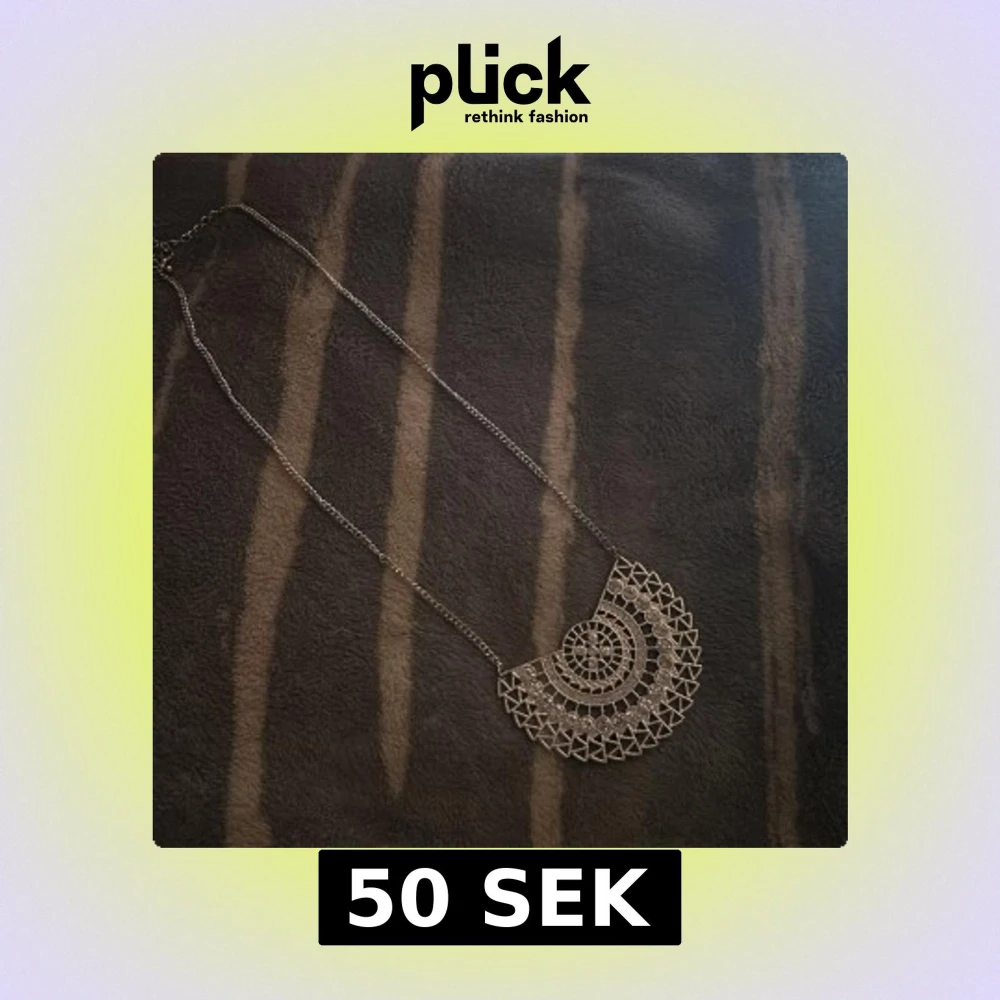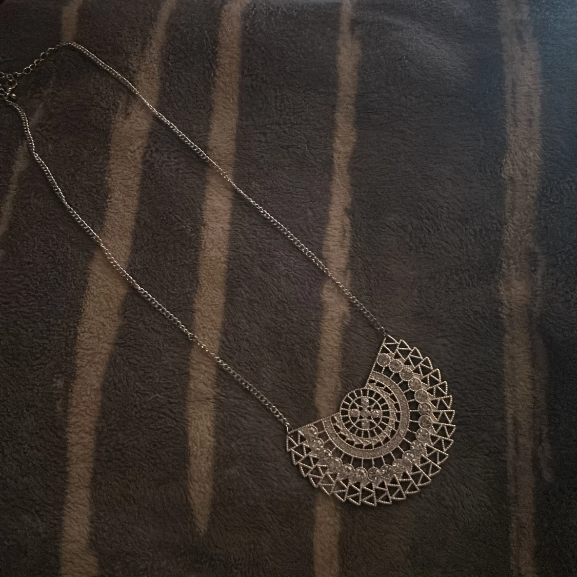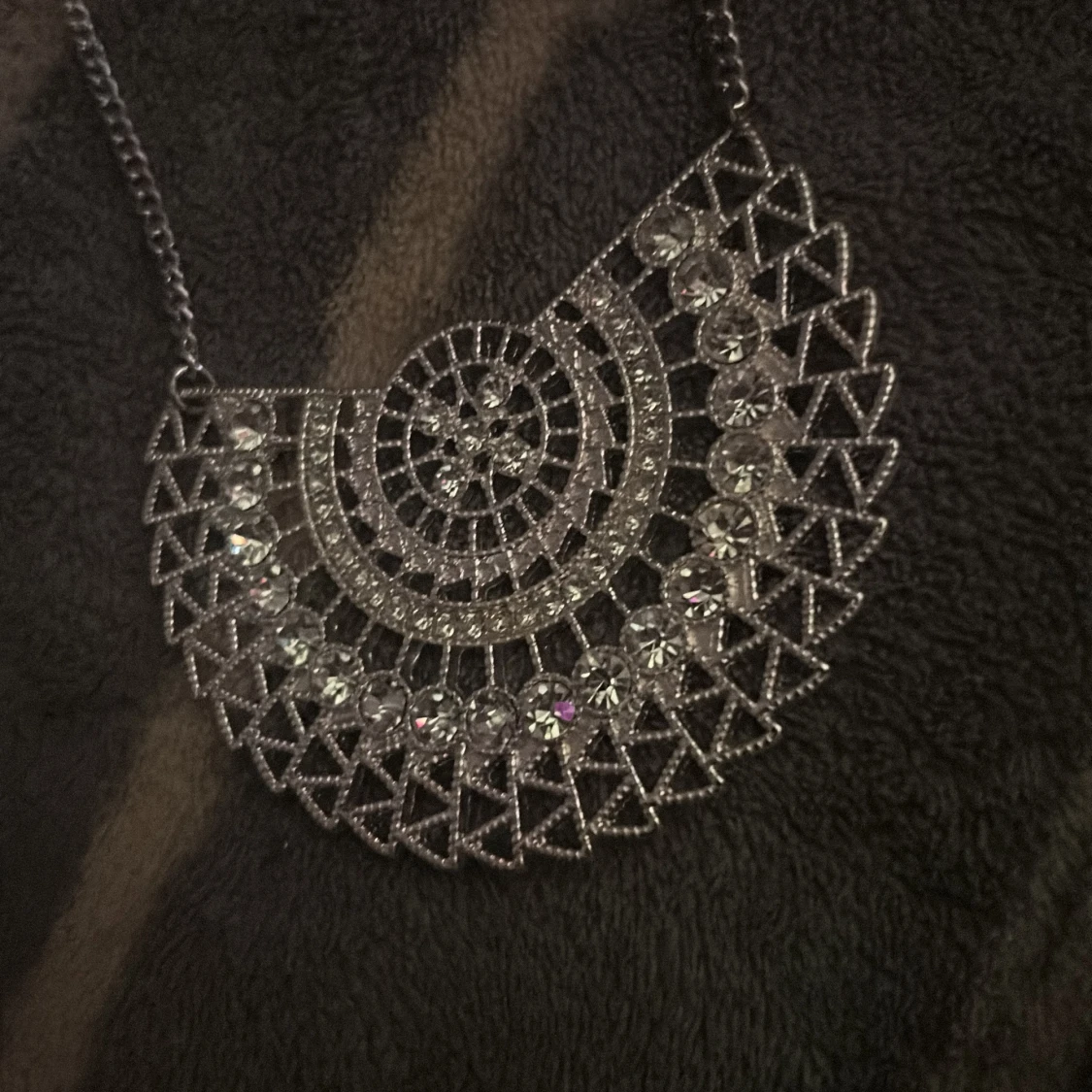 Unikt statement halsband i silverfärg med halvcirkelformad, geometrisk hängare. Hängaren har ett detaljerat mönster av cirklar och trianglar, dekorerat med gnistrande stenar som ger en glittrig effekt. Perfekt för att lyfta vilken outfit som helst.