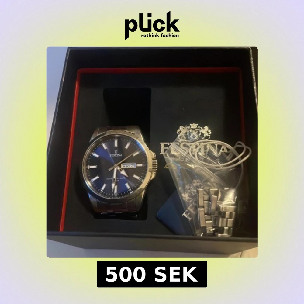 Säljer en stilren Festina herrklocka med blå urtavla och dag- och datumvisning. Klockan har ett klassiskt armband i silverfärgat rostfritt stål och kommer med extra länkar. Perfekt accessoar för dig som gillar en clean och modern look.