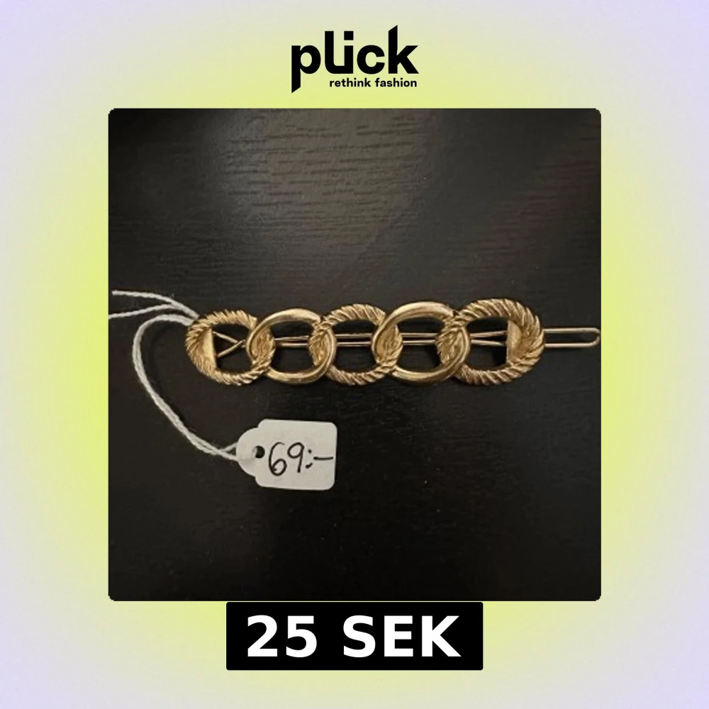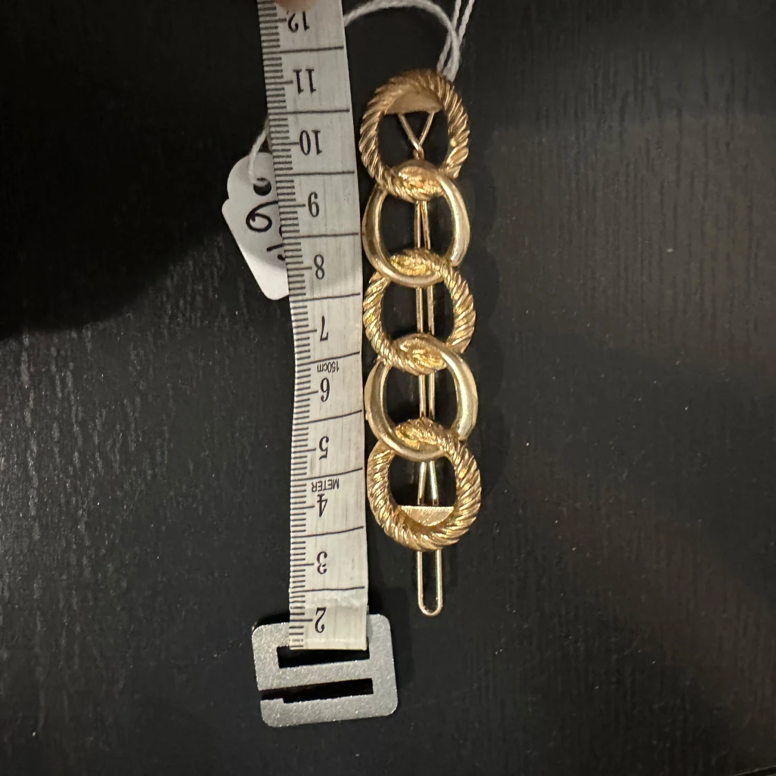 Elegant guldfärgad hårklämma med fem sammanlänkade ringar i ett repmönster. Perfekt för att ge en stilfull touch till din frisyr. Klämman är cirka 8 cm lång och har en säker låsmekanism.