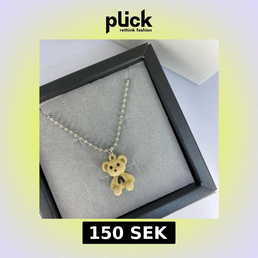 Halsband med kulkedja i silverfärg och en gullig beige nalleberlock i filtmaterial. Nallen har svarta detaljer och en liten rosett runt halsen. Ej använd utan kommer från min small business.