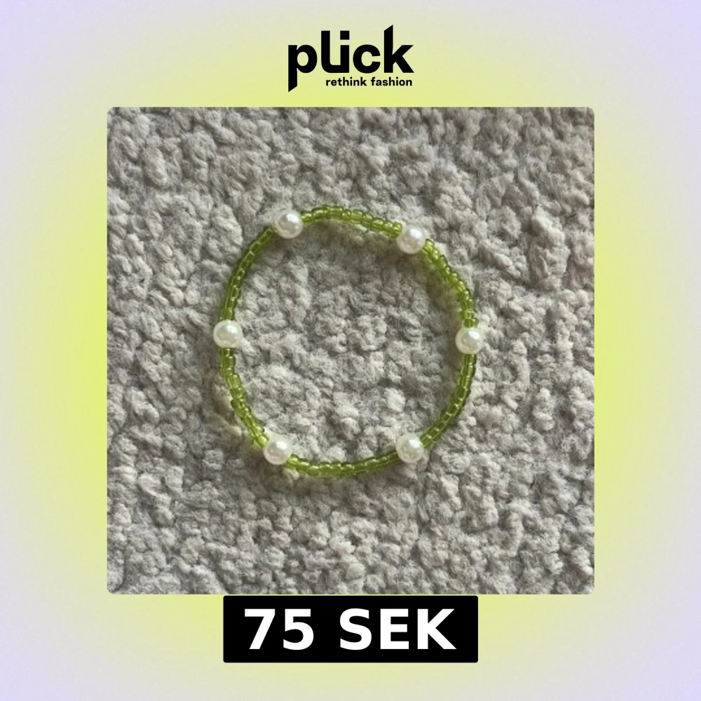 Fint handgjort pärlband med små olivgröna pärlor och lite större vita pärlor. Armbandet är nosize men är i tjej storlek så passar dig om du har handledsmått 15-18 cm
