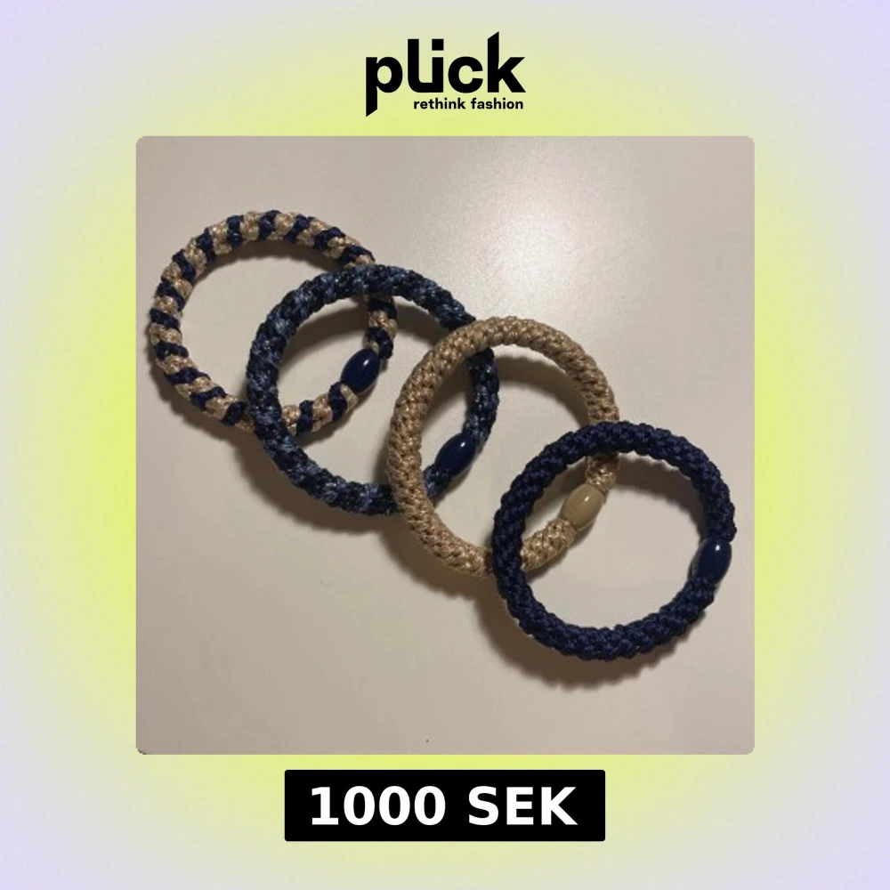Säljer fyra snygga Kknekki armband i olika blå och beige nyanser. Två är enfärgade, ett i marinblått och ett i beige, och två är randiga i blått och beige. Alla har en oval pärldetalj med Kknekki-loggan. Perfekta för att mixa och matcha till din stil!