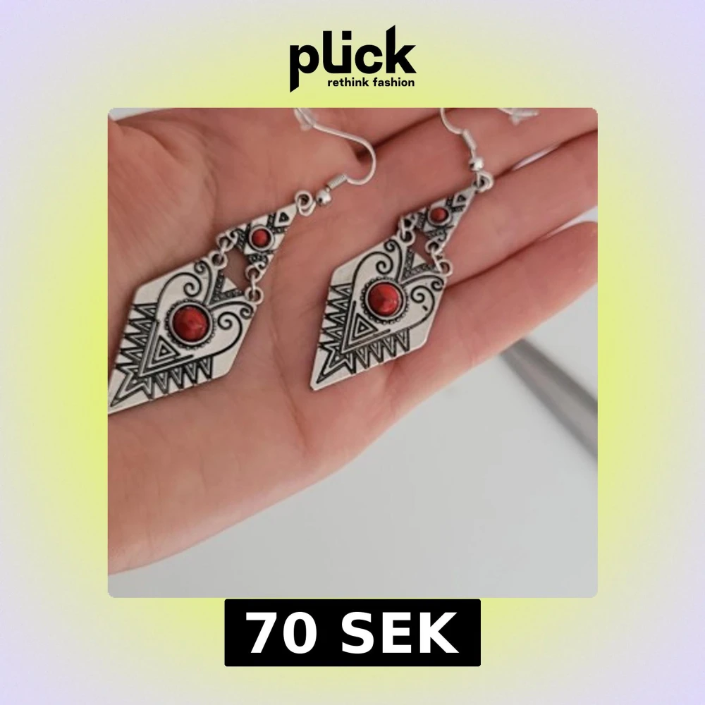 Helt nya Unika silvriga örhängen i geometrisk form med snygga svarta mönster och röda stenar i mitten. De har coola tribal-inspirerade detaljer och hängande design som verkligen sticker ut. Perfekta för dig som vill ha något annorlunda och färgstarkt till din stil.