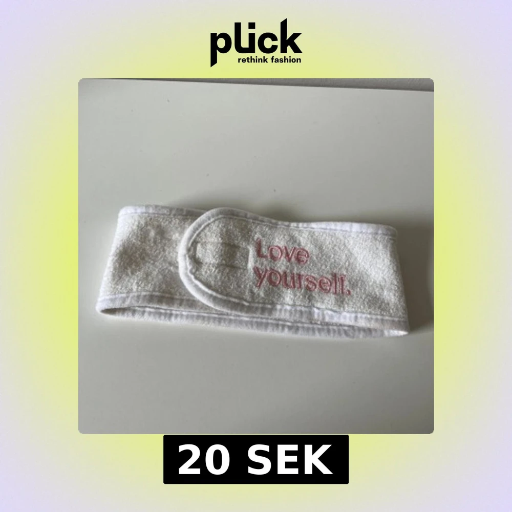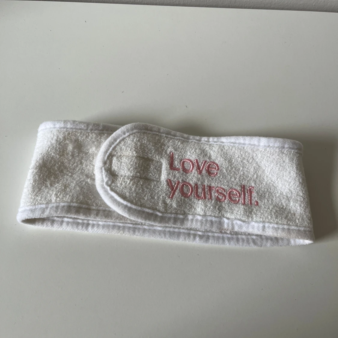 Säljer ett vitt hårband i mjuk frotté med broderad texten 'Love yourself.' i rosa framtill. Diademet har kardborreknäppning för enkel justering och passar perfekt för att hålla håret borta vid hudvård eller sminkning.