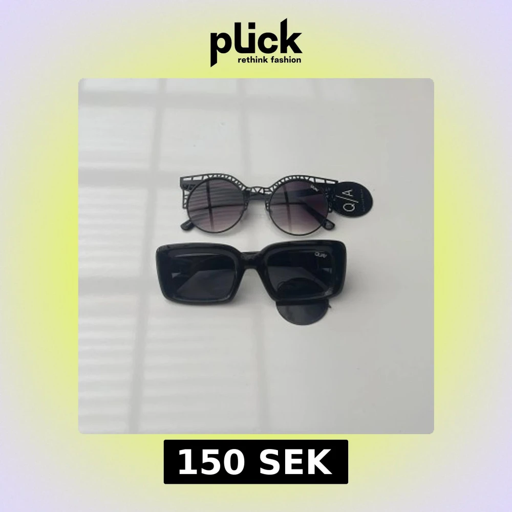 Säljer två par glasögon ett par med rektangel aktig båge kallas GOING-SOLO. Annat par med mönster båge och mörk lins kallas FLEUR