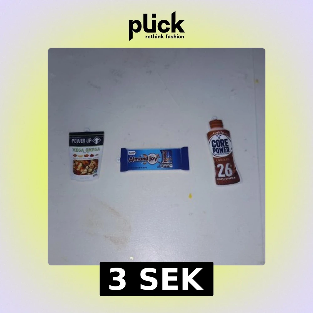 Bilden visar tre miniatyrförpackningar av snacks och dryck: Power Up Mega Omega, Almond Joy och Core Power Chocolate.