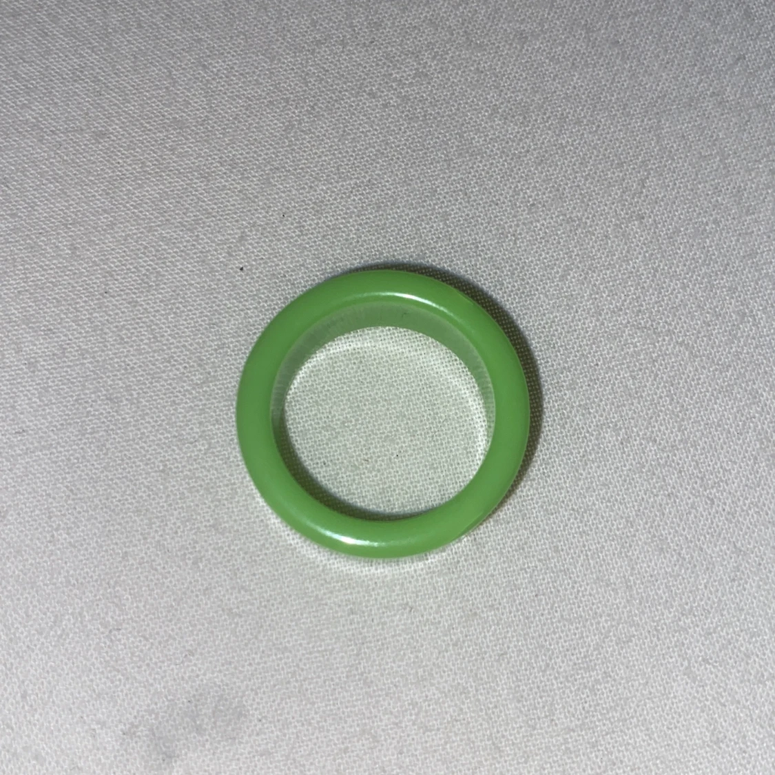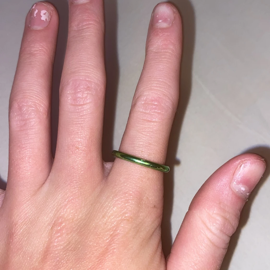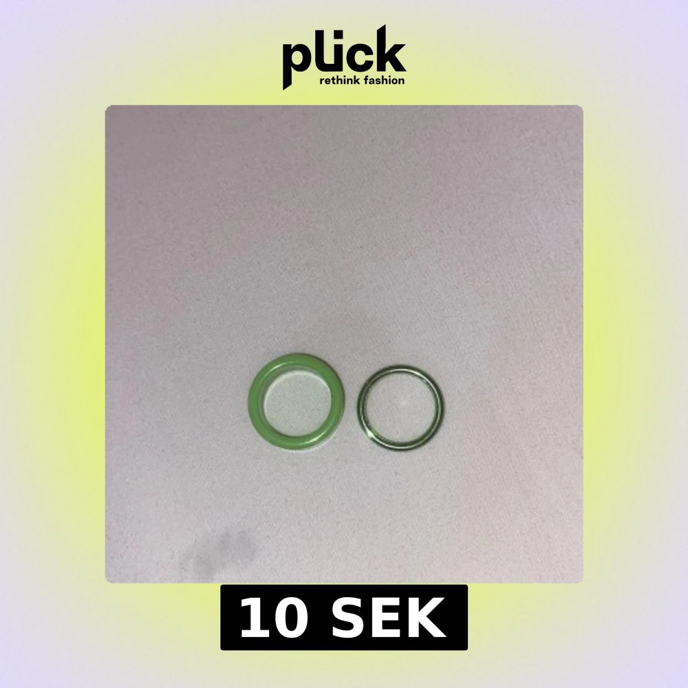 Säljer två stilrena ringar i gröna nyanser. Den ena ringen är i blank plast med en bredare form och ljusgrön färg, medan den andra är smalare i metall med en mörkare grön ton och glansig finish. Perfekta för att addera färg till din look.
