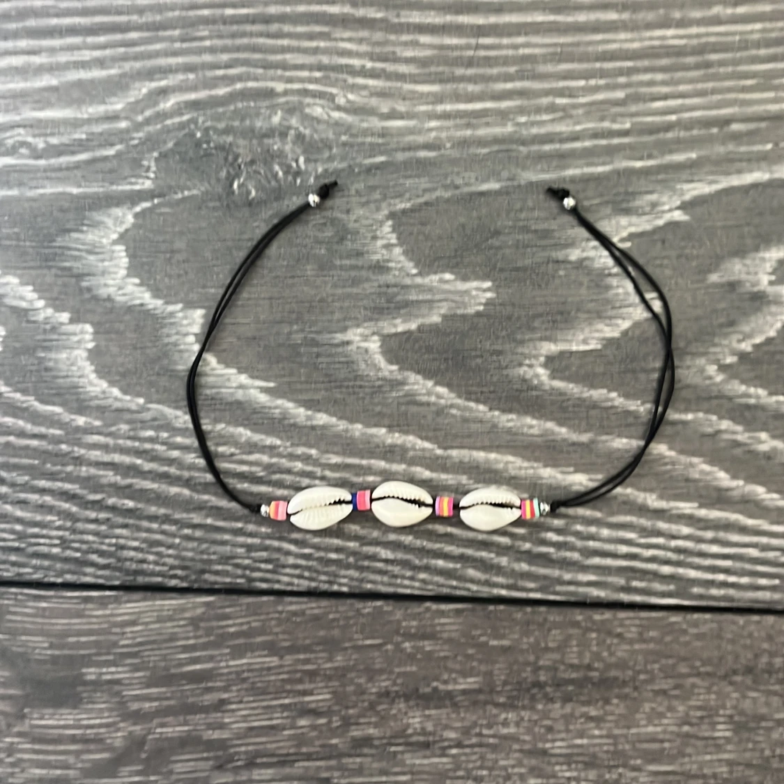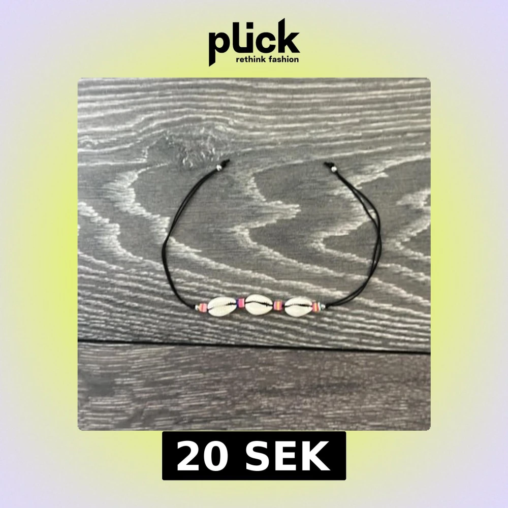 Köpt i Spanien. Ett snyggt armband med tre vita snäckor och färgglada pärlor i rosa, lila och gult på en svart justerbar tråd. Perfekt accessoar för en somrig vibe och strandkänsla. Passar dig som gillar boho-stil och unika detaljer.