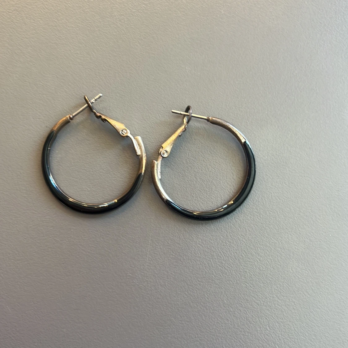 Säljer två par klassiska hoops örhängen i silver/svart färg. Ena paret är större och det andra är lite mindre.