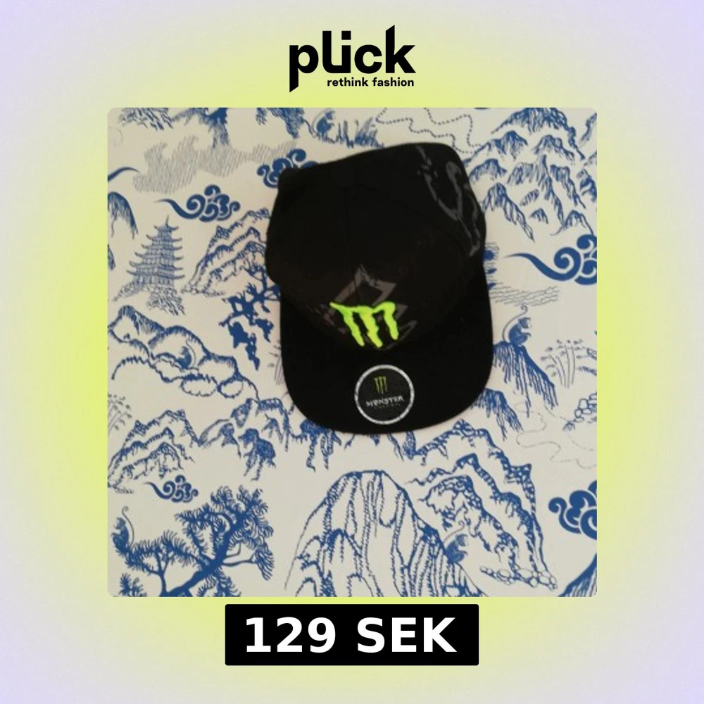 Svart keps med grön Monster Energy-logga framtill och rund skärm. Märke på framsidan och etikett på skärmen. Perfekt för dig som gillar streetwear och sportig stil.