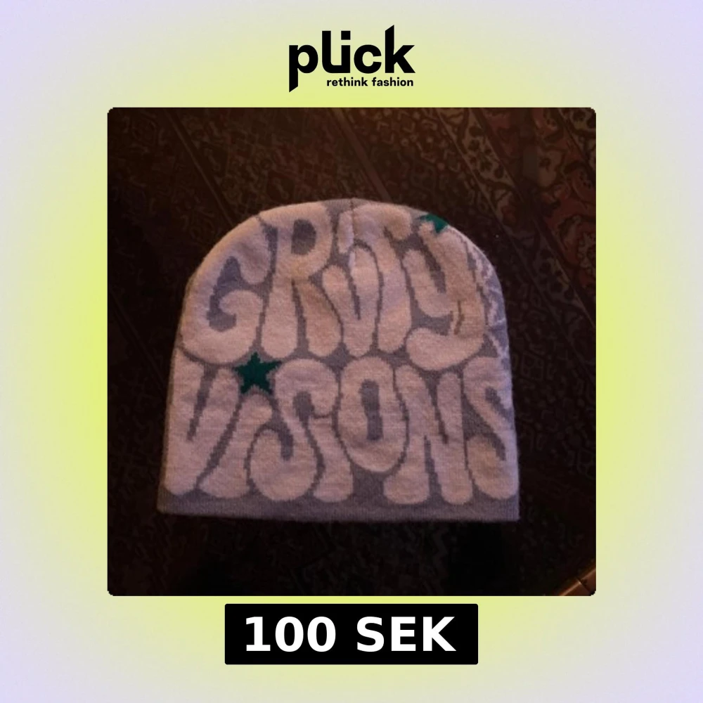 Snygg grå mössa med texten 'GROOVY VISIONS' i stora vita bokstäver och gröna stjärnor. På baksidan finns ett coolt spindelnätsmönster. Perfekt för att hålla stilen i kylan!
