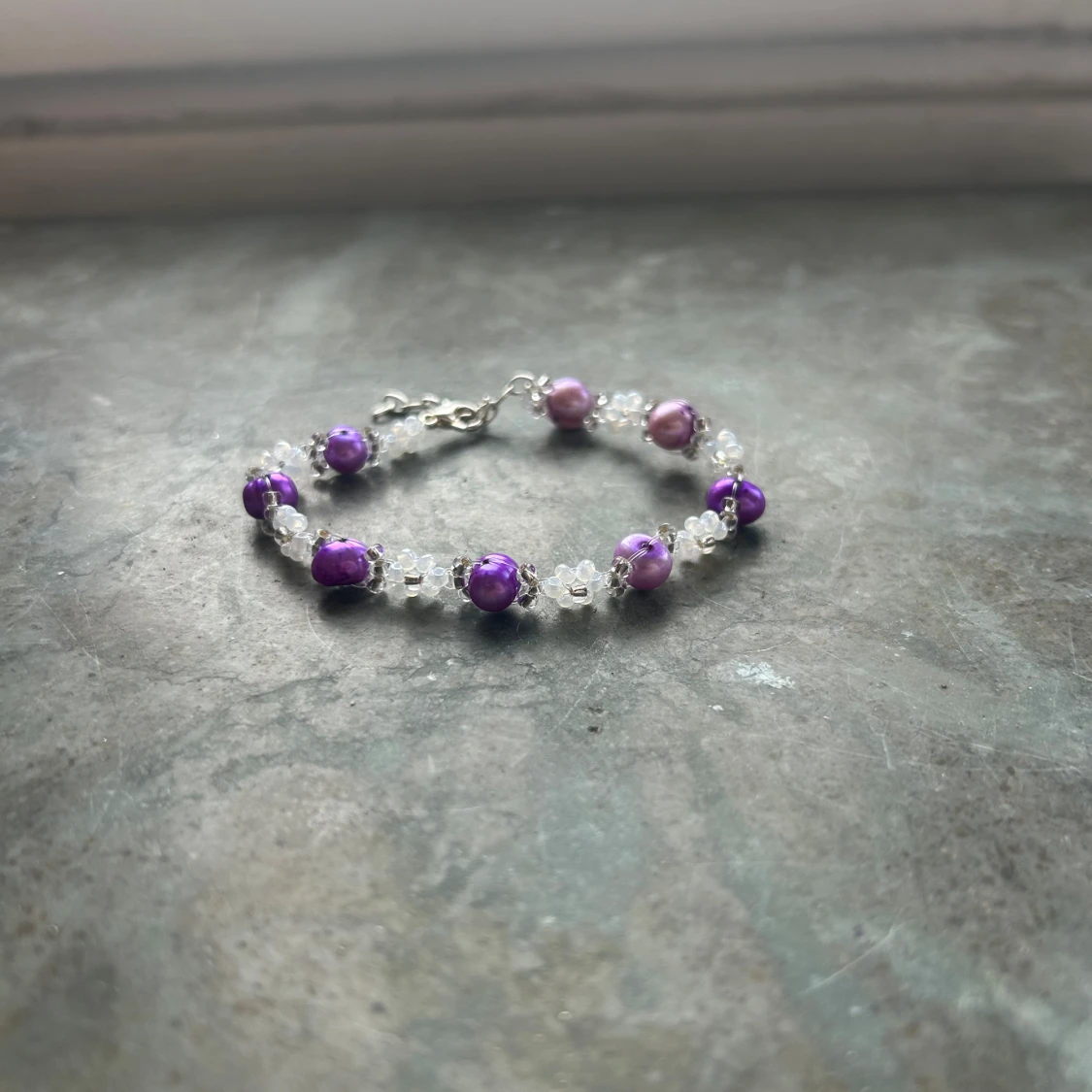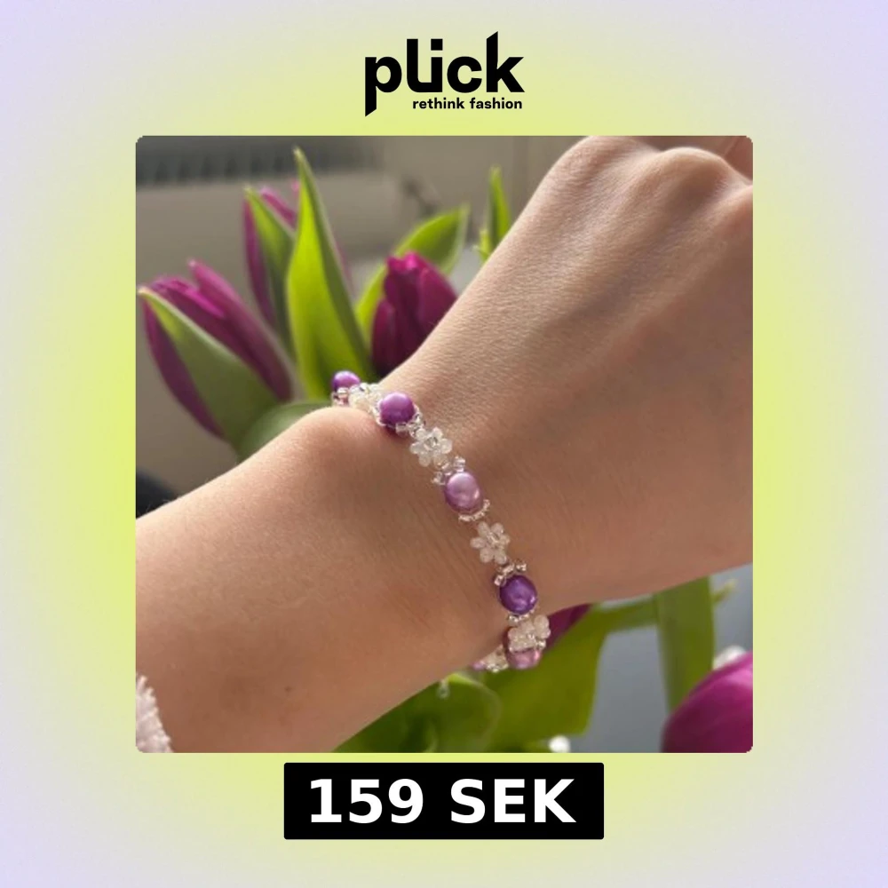 Charmigt armband med vita och lila pärlor i varierande nyans, dekorerat med små blommor. Perfekt för att ge en färgklick till din outfit. Armbandet har en justerbar kedja för perfekt passform. Gjord i äkta rocaillespärlor och silverpläterad kedja.