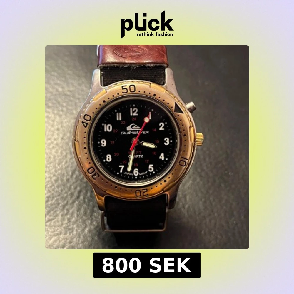 Säljer en Quiksilver klocka med svart urtavla och röda visare. Klockan har en boett i metall med en brun patina och en svart rem. Den är vattentålig upp till 195ft och har japansk quartzrörelse. Perfekt för den som gillar en robust och stilren design.