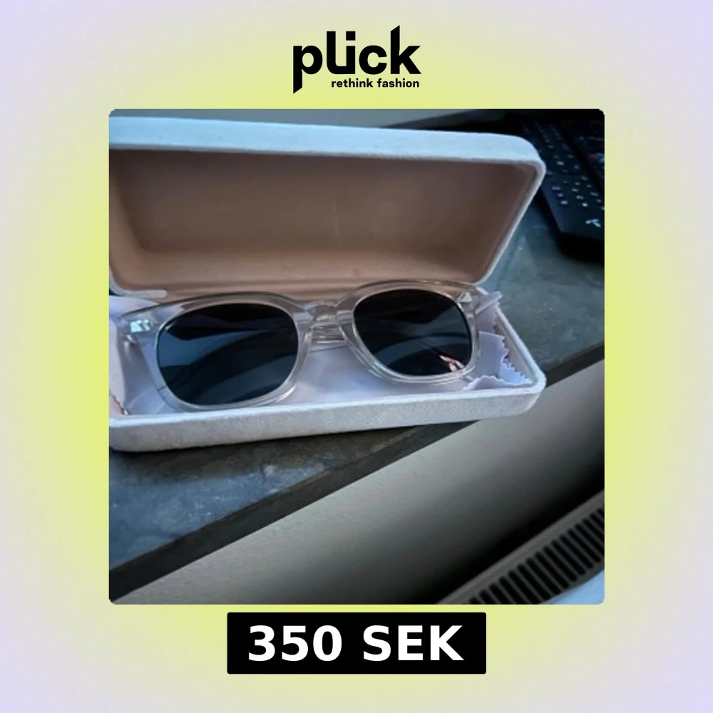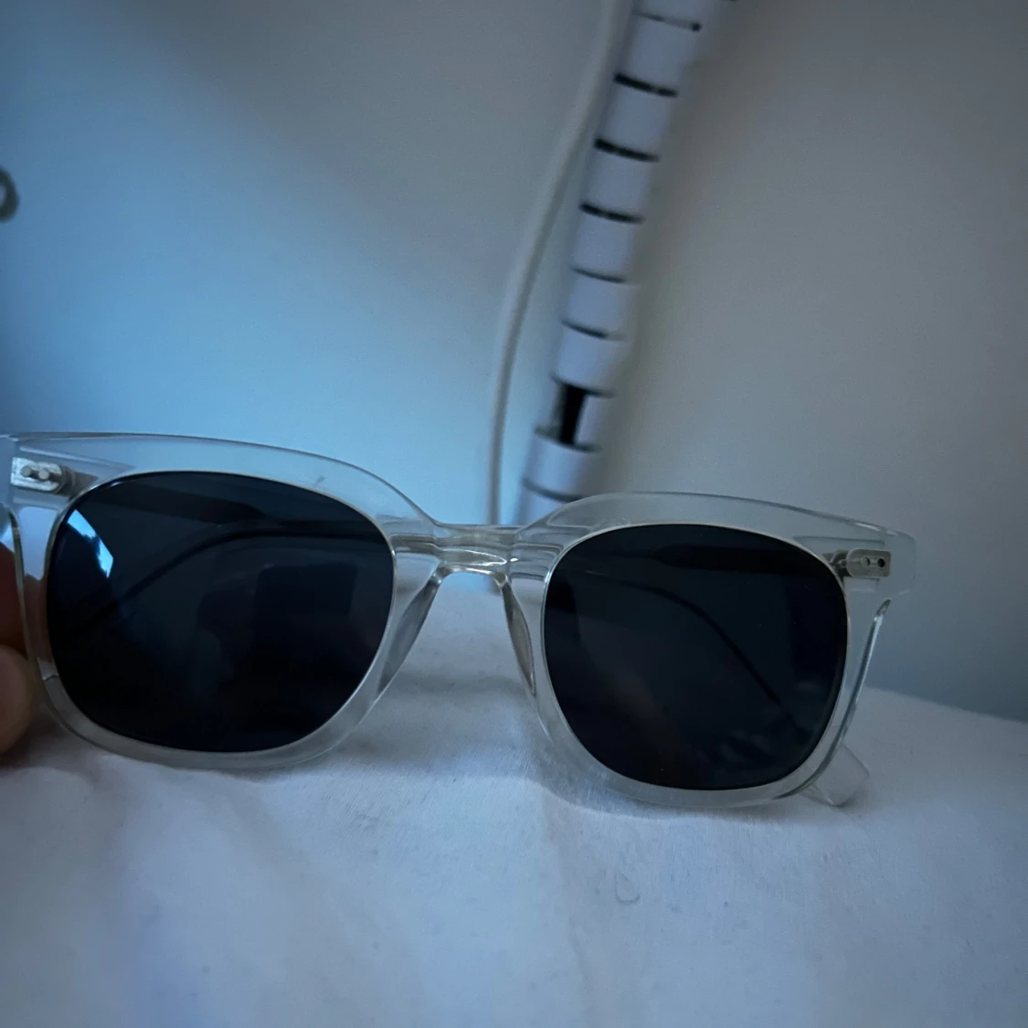 Snygga solglasögon med transparent, fyrkantig båge och mörka glas. Monten solglasögon använda max 5 gånger. Skick 10/10