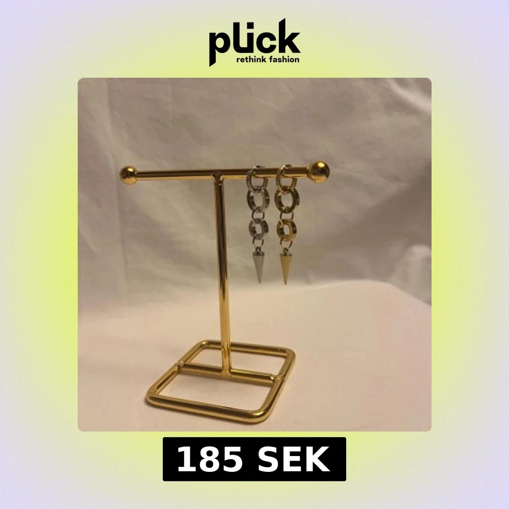 Säljer ett par coola örhängen med kedjelänkar i silver och guldton, avslutade med spetsiga spikes. Örhängena har ringar med små glittriga stenar upptill och hängande länkar som ger en edgy vibe. Perfekt för dig som gillar statement-smycken.