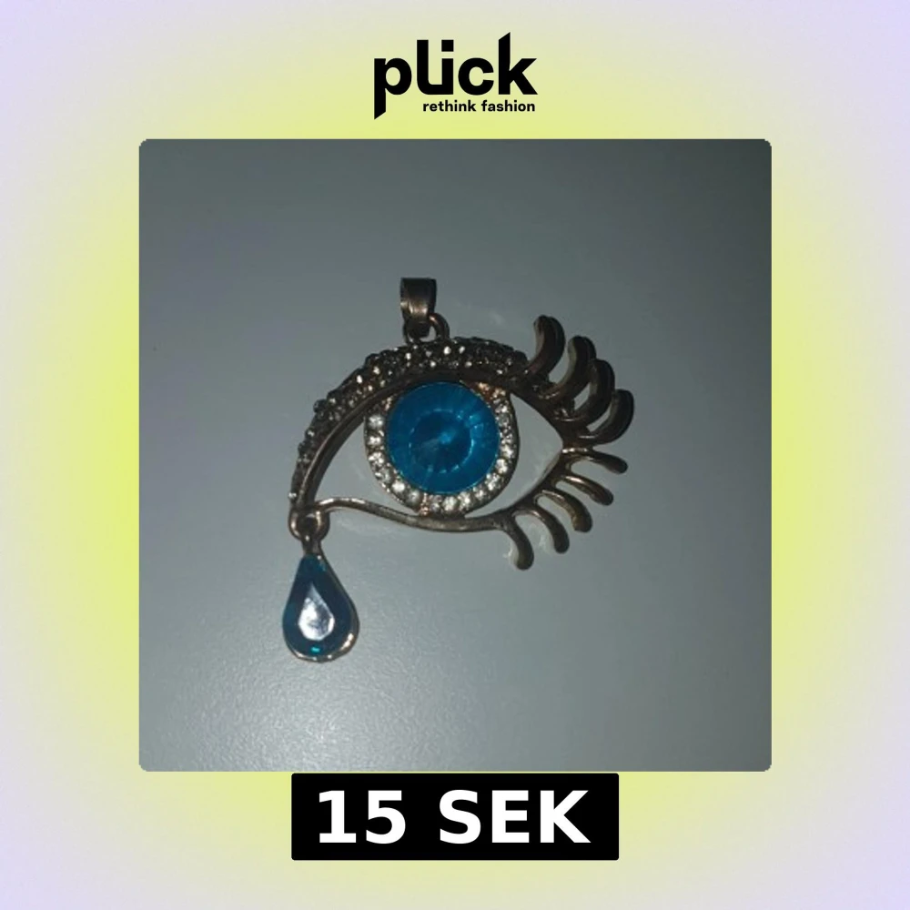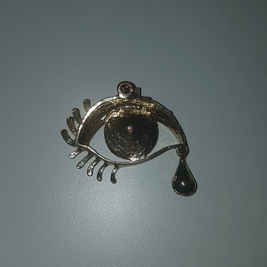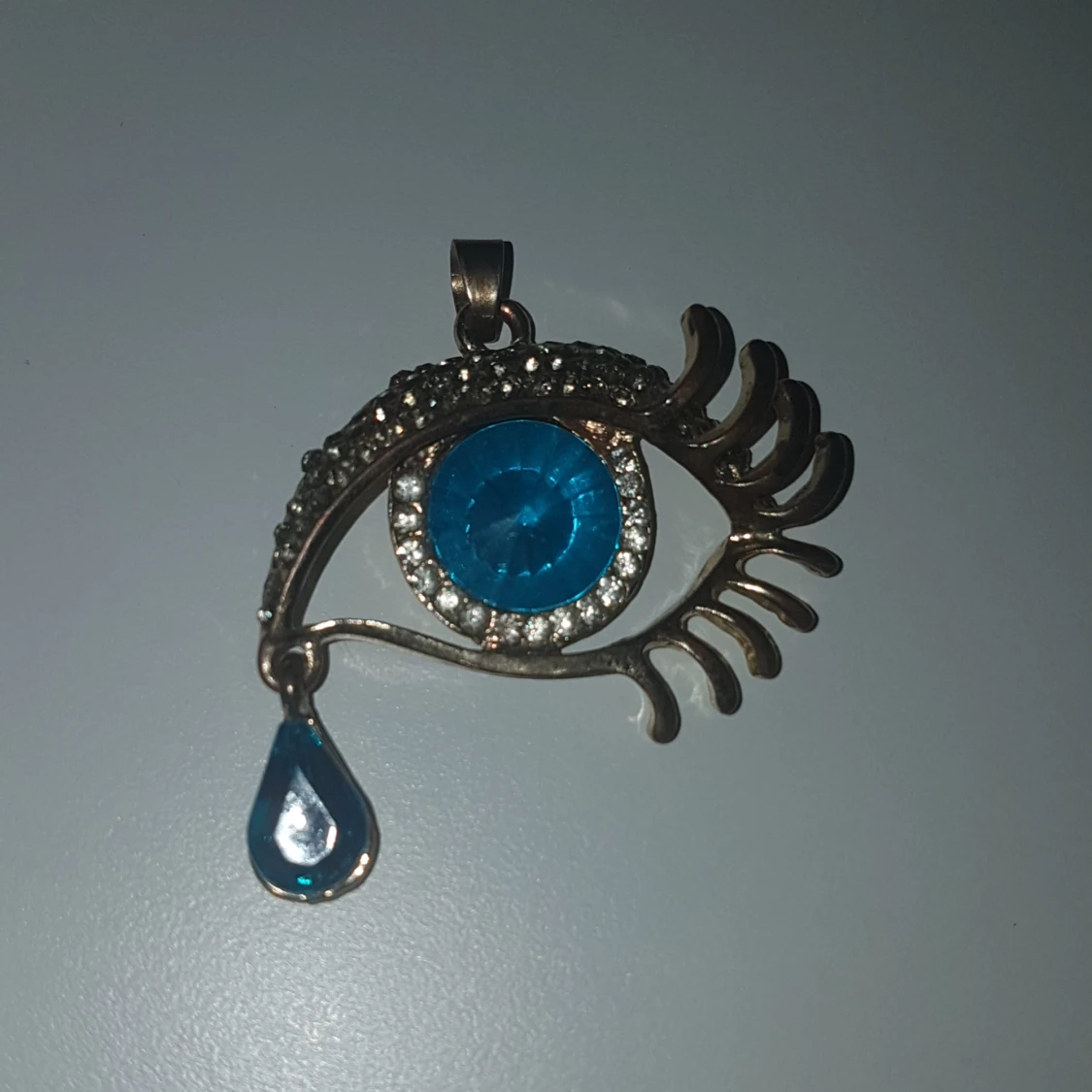 Unikt halsbandshänge format som ett öga med långa fransar, dekorerat med glittrande stenar runt en blå iris och en blå droppe som tår. Hängsmycket är i guldtonad metall och har en cool, konstnärlig vibe. PRIS KAN DISKUTERAS!