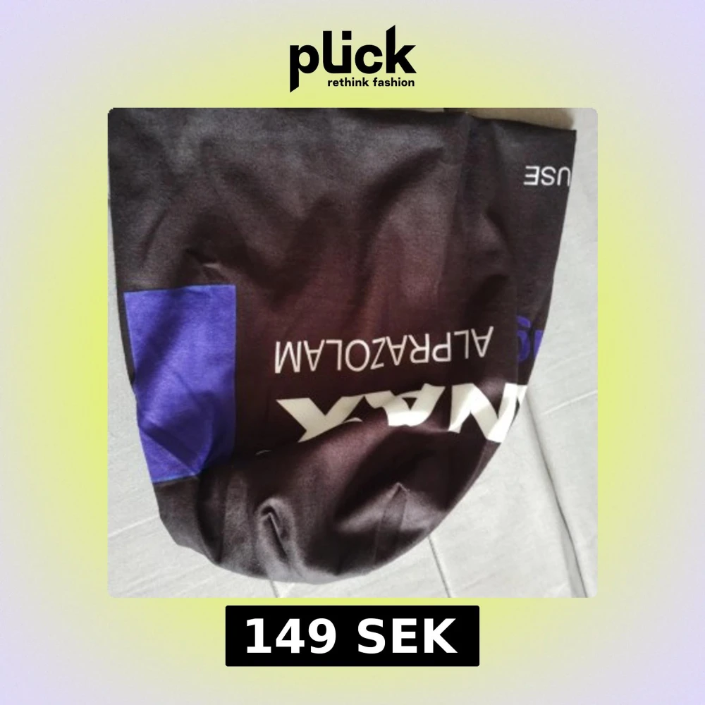 Svart mössa med stort vitt och lila tryck som liknar en Xanax-förpackning. Texten är tydlig och designen sticker ut med medicinskt tema. Materialet känns som mjuk polyester, perfekt för dig som gillar unika och edgy accessoarer.