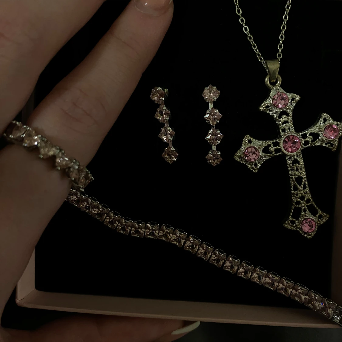 Elegant smyckeset med ett halsband med korshänge dekorerat med rosa stenar, matchande örhängen och ett armband. Perfekt för att ge en glittrig touch till din outfit. Även en ring