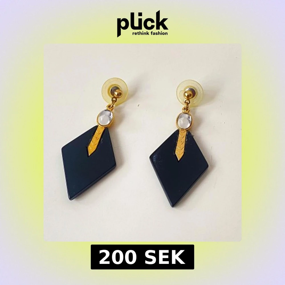 Snygga vintage örhängen i svart och guld med en elegant kristalldetalj. De har en geometrisk form som ger en modern touch. Perfekta för att lyfta vilken outfit som helst.