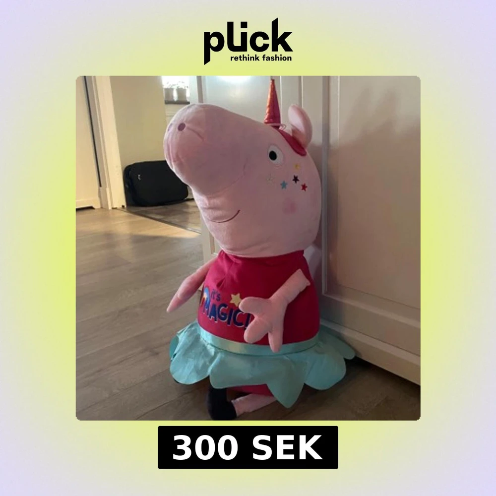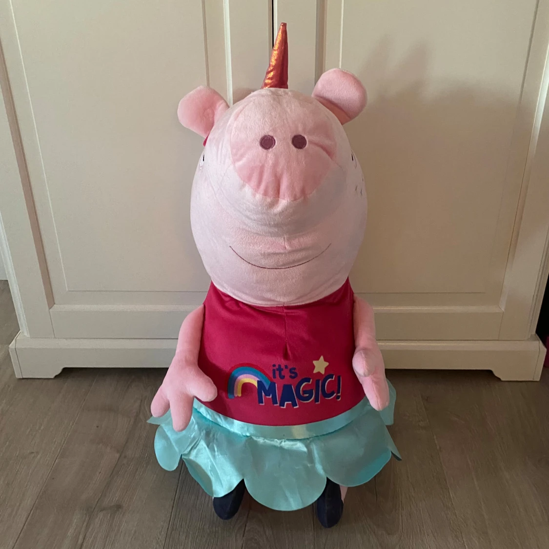 En stor Peppa Pig gosedjur klädd i en röd tröja med texten 'It's Magic!' och en turkos kjol. Peppa har ett glittrigt enhörningshorn på huvudet och färgglada stjärnor på kinden. Den är ca 75cm hög