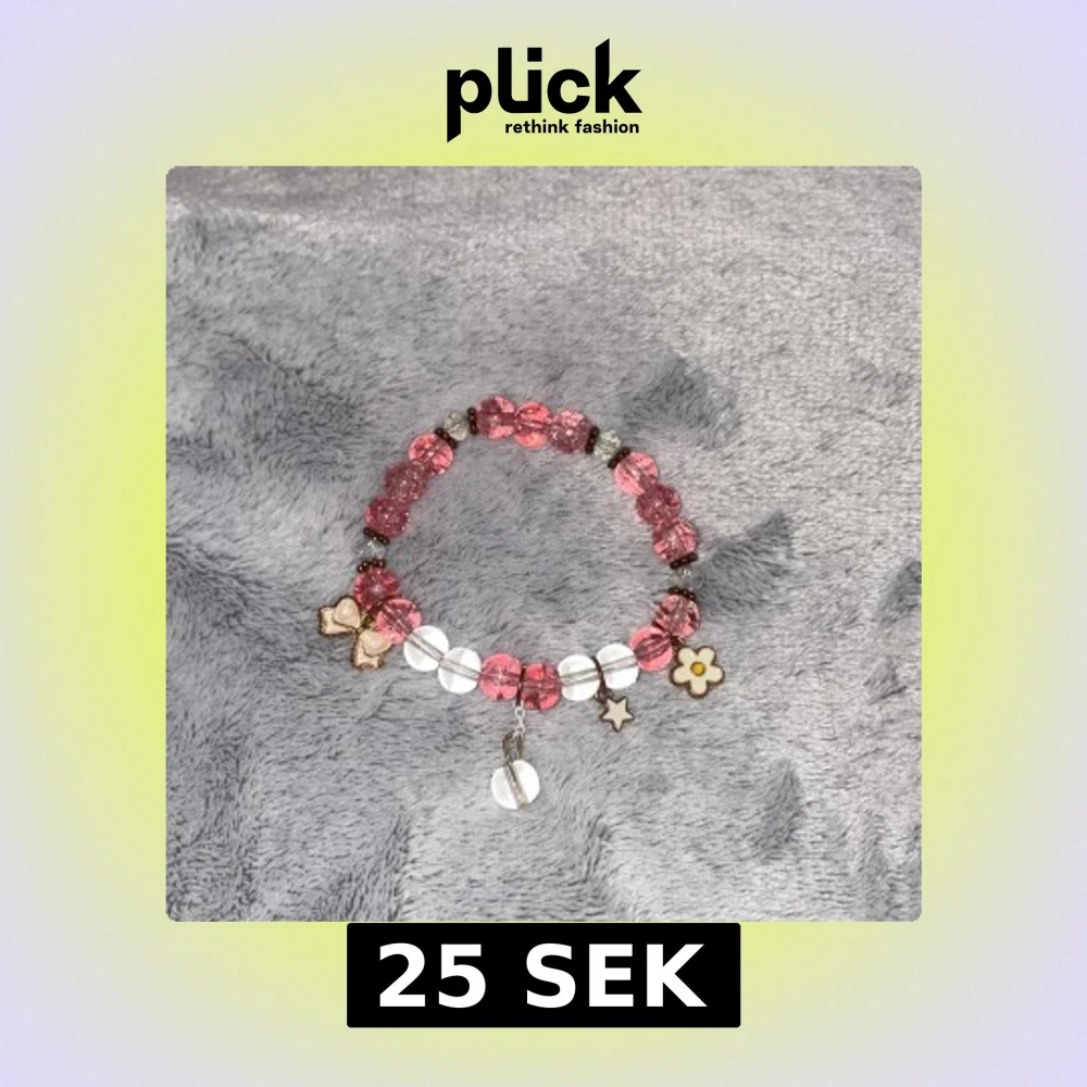 Sött armband med rosa och vita pärlor, dekorerat med berlocker i form av rosett, stjärna, blomma och en rund genomskinlig pärla. Perfekt accessoar för att ge en lekfull touch till din stil.