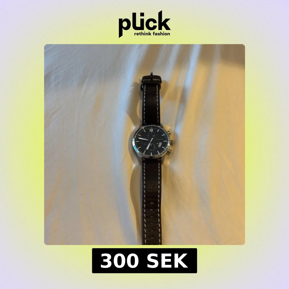 Stilren klocka med svart urtavla och brunt läderarmband med vita sömmar. Klockan har tre mindre urtavlor och en datumvisare. Perfekt för den som söker en elegant accessoar.