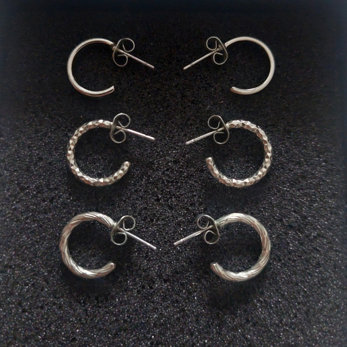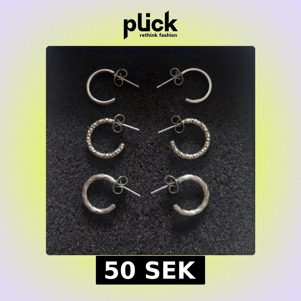 Säljer ett set med tre par stilrena silverörhängen. Ett par är släta, ett par har en glittrig yta och det sista paret har en vriden design. Perfekta för att mixa och matcha till olika tillfällen.