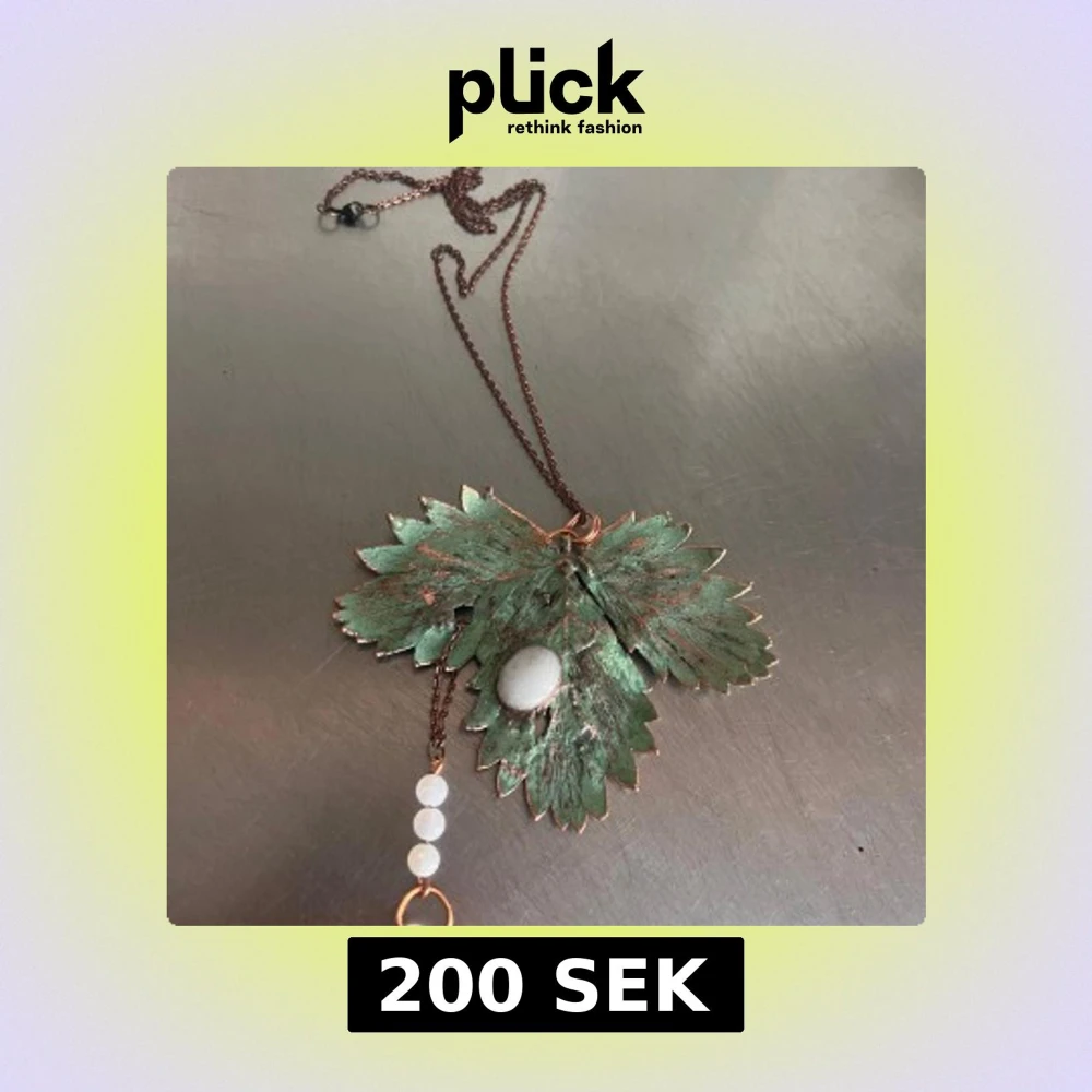 Unikt halsband med ett stort grönt blad i metall och kopparfärgad kedja. Framsidan har en vit pärla och flera små pärlor hänger i en kedja. Baksidan har en dekorativ koppartråd. Perfekt för dig som gillar naturinspirerade smycken.