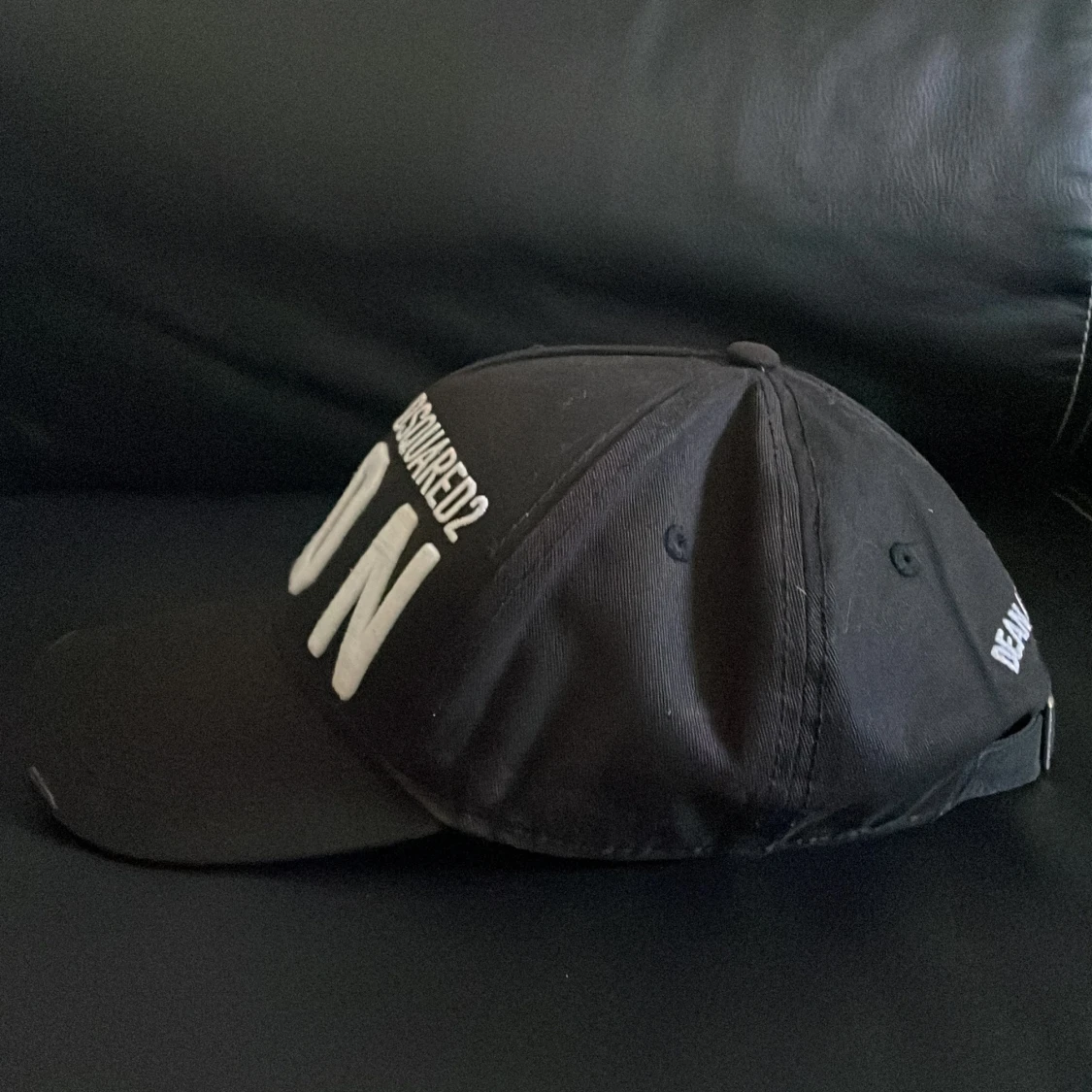 Svart keps från Dsquared2 med stor vit broderad text 'ICON' framtill och 'DEAN & DAN CATEN' baktill. Justerbart spänne bak för perfekt passform. Klassisk böjd skärm och ventilerande hål upptill.