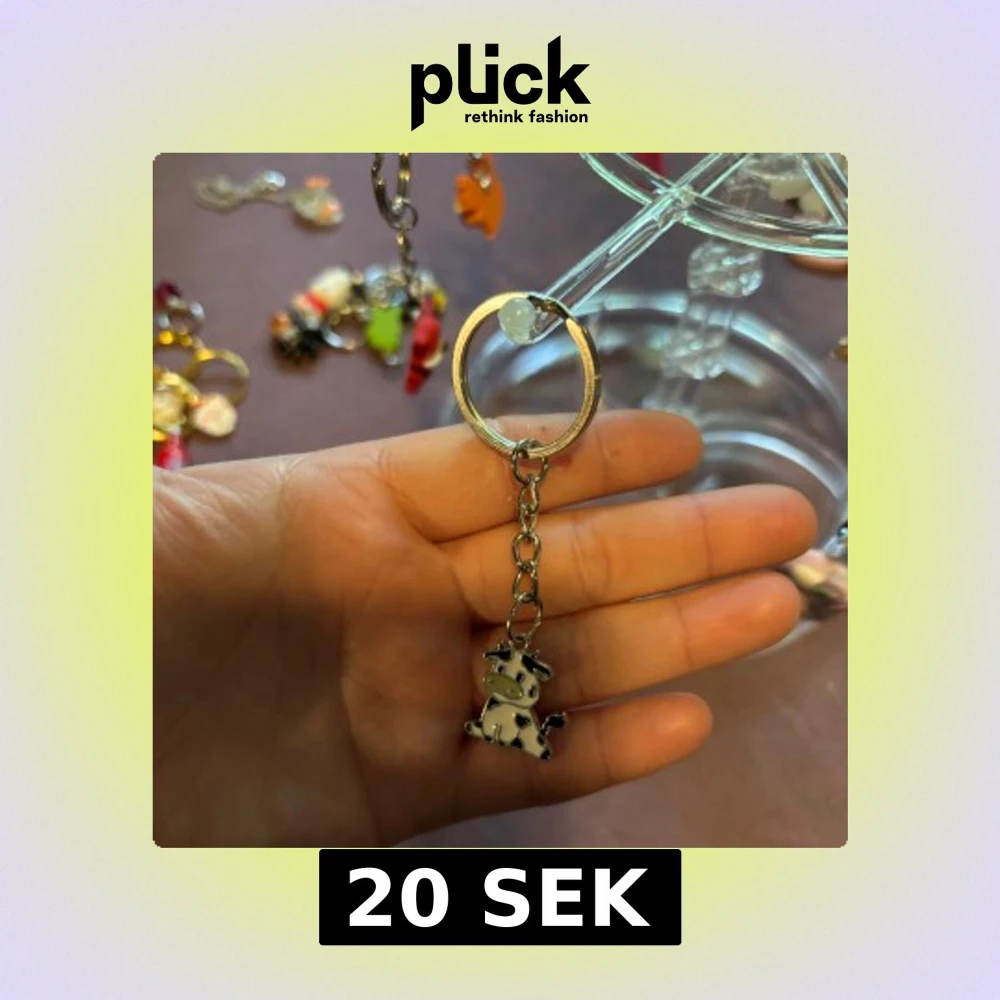 Nyckelring med en liten berlock i form av en tecknad ko. Koberlocken är vit med svarta fläckar och har en söt, lekfull design. Metallkedja och ring i silverfärg. Perfekt accessoar för att piffa upp dina nycklar eller väska.