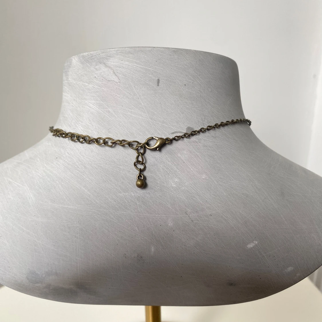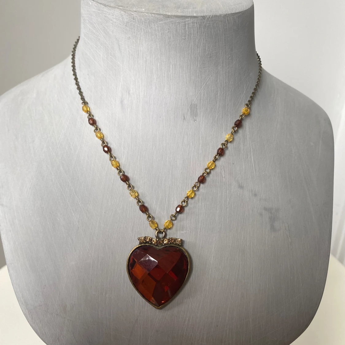 Unikt halsband med stort hjärtformat hänge i orange och brunt glas, infattat i antikguldig metall. Kedjan är dekorerad med små pärlor i gult och brunt som ger en vintagekänsla. Ovanför hjärtat sitter gnistrande stenar som extra detalj. Perfekt statement-piece för dig som gillar färg och retrostil.