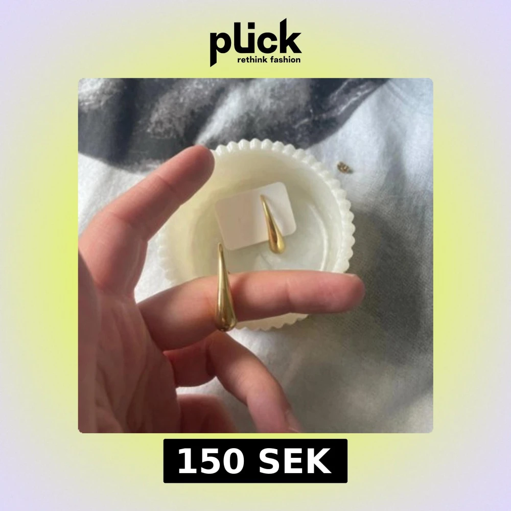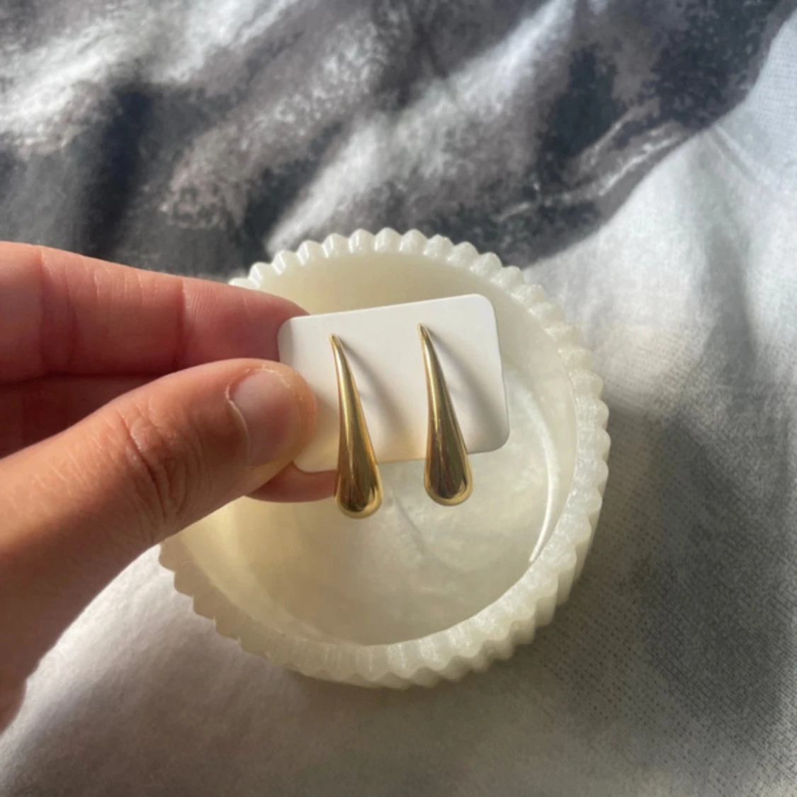 Säljer ett par stilrena örhängen i guldig färg med droppformad design. Köpta i Turkiet! De är släta och blanka, vilket ger en modern och trendig look. Perfekta för dig som gillar minimalistiska smycken med en twist.