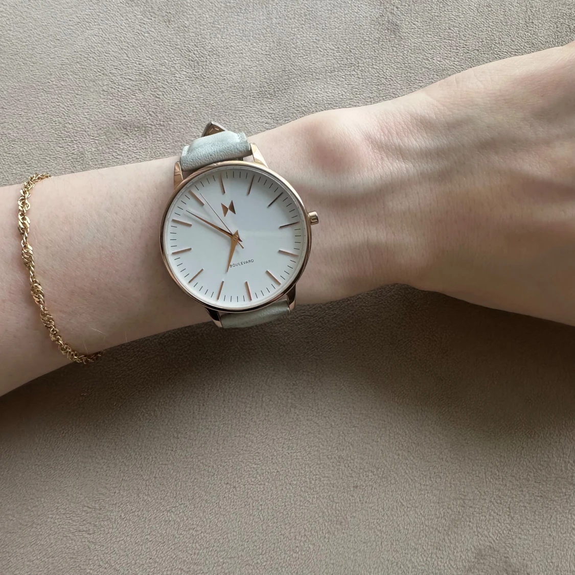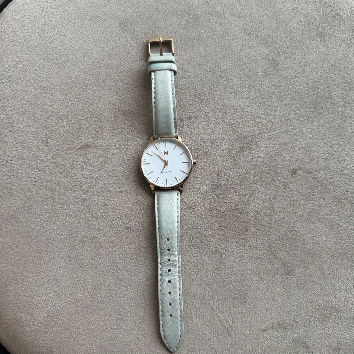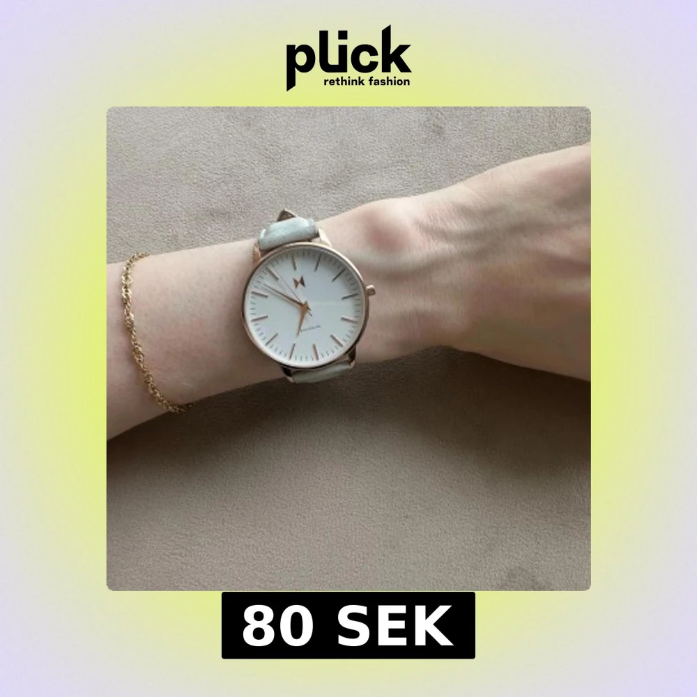 Boulevard vit/läder, 38mm. Använd men i gott skick, inga repor på glaset. Dock finns någon missfärgning på klockbandet (se bild). Behöver nytt batteri. Nypris 1085kr