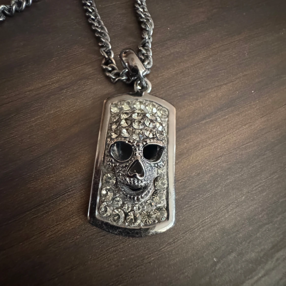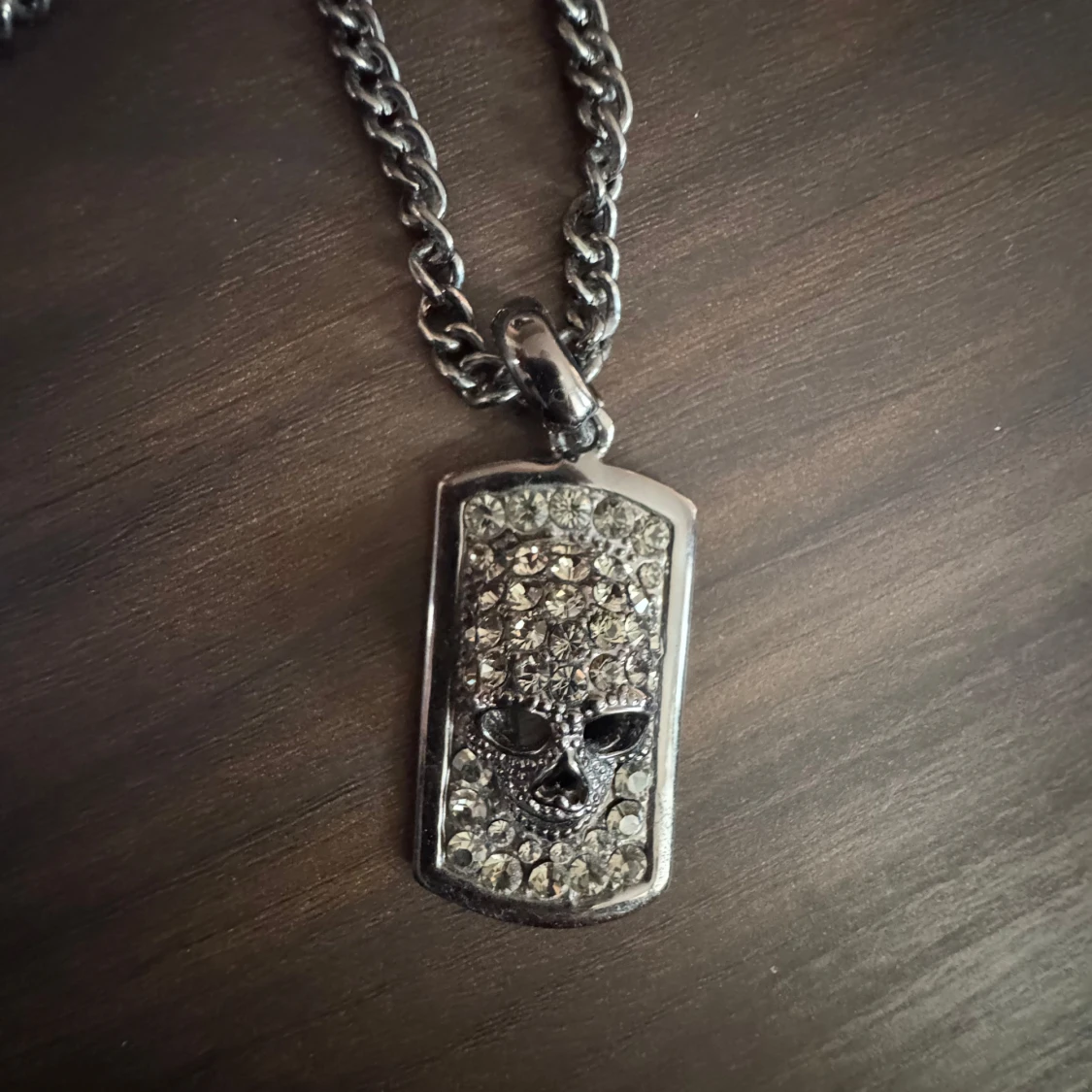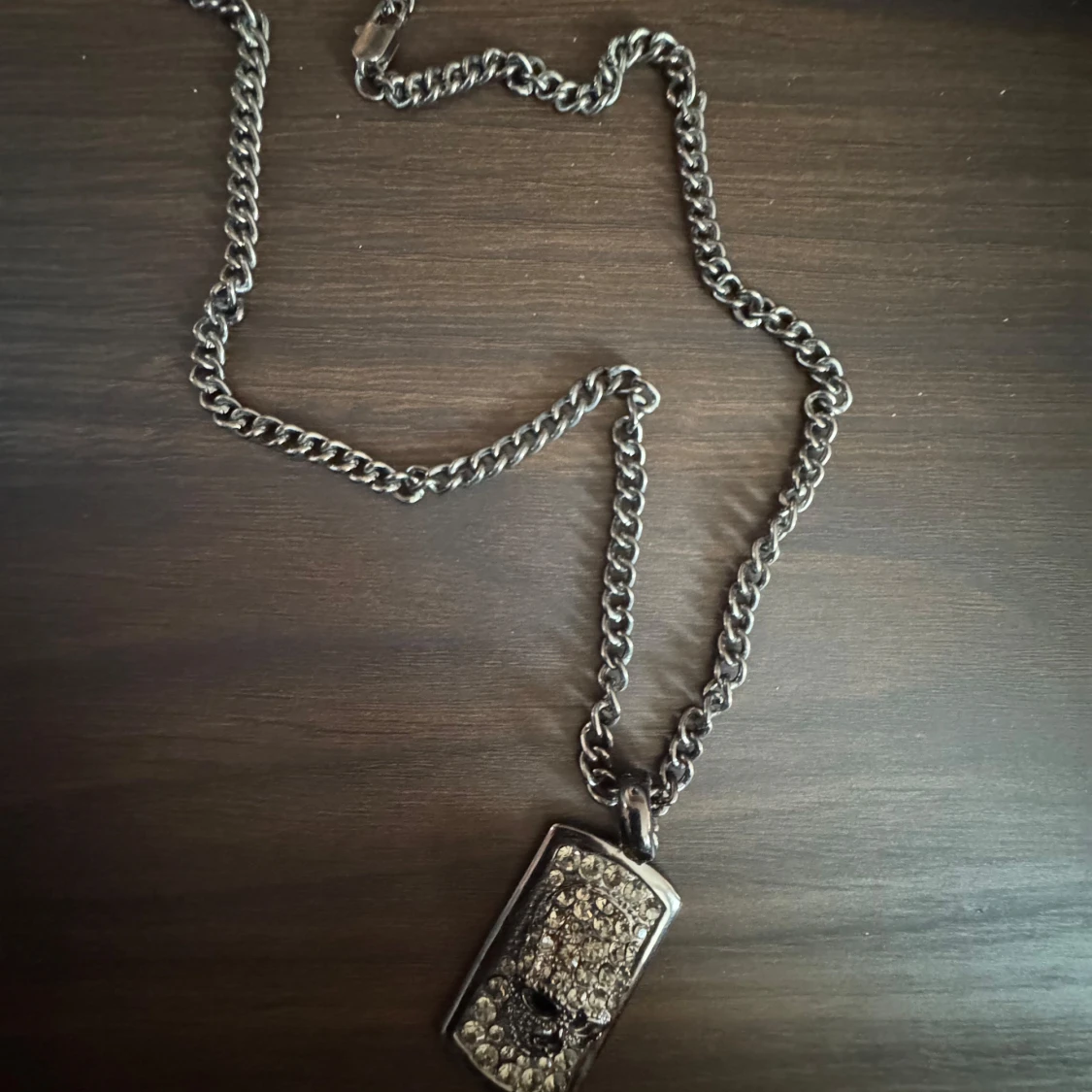 Coolt silverfärgat halsband med ett rektangulärt hänge prytt med glittrande stenar och en dödskalle i mitten. Perfekt för att ge din outfit en edgy touch.