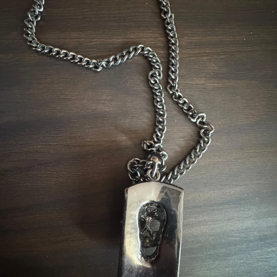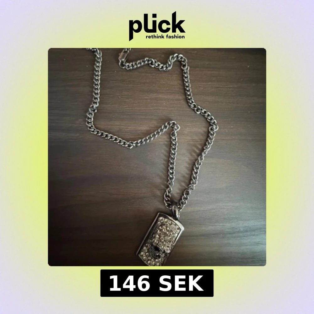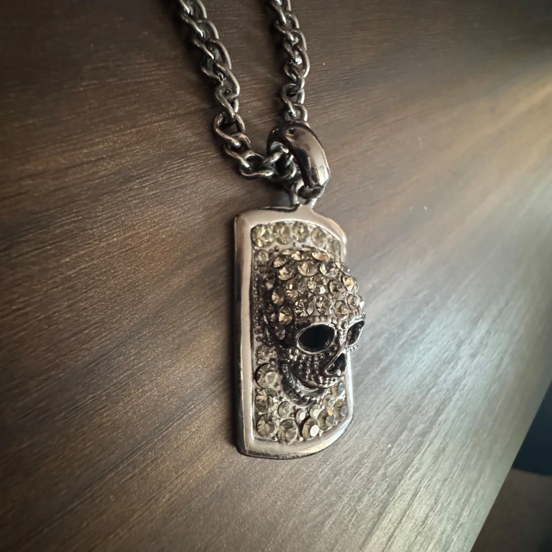 Coolt silverfärgat halsband med ett rektangulärt hänge prytt med glittrande stenar och en dödskalle i mitten. Perfekt för att ge din outfit en edgy touch.